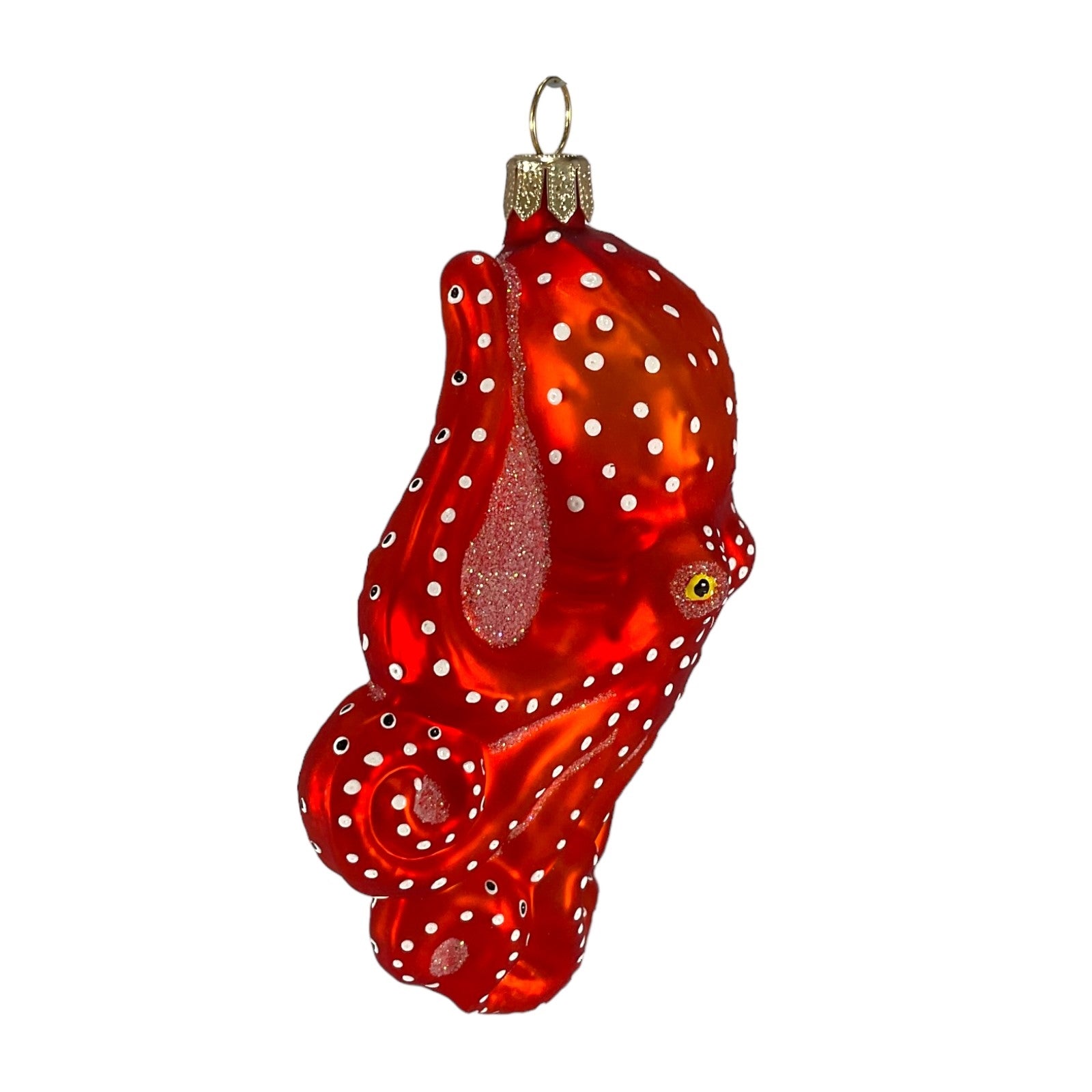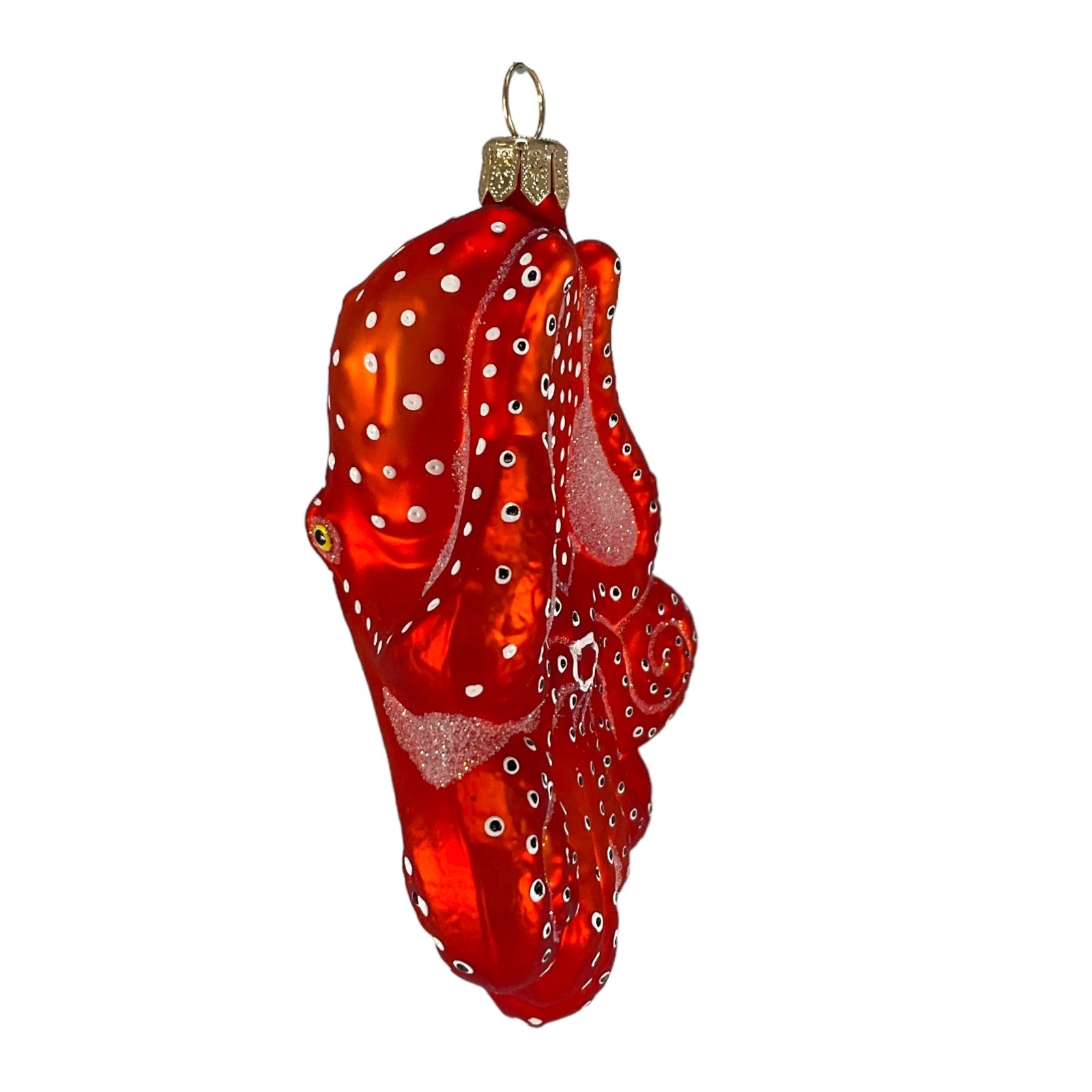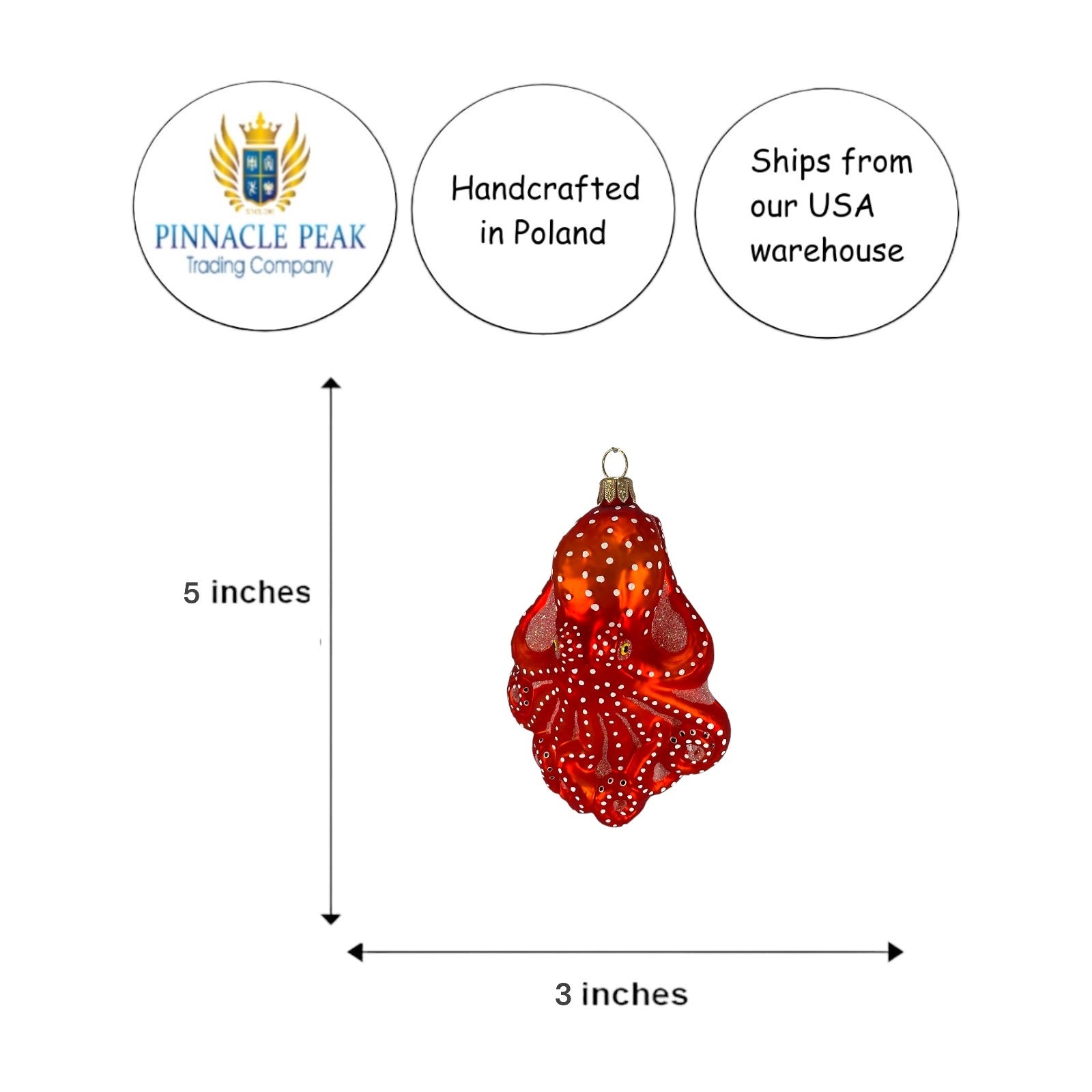 Red Octopus Ornament. Handcrafted in Poland. Hand-painted by Polish artisans. Made from mouth blown glass. Approximately 4.25 inches tall (11 cm). Approximately 3 inches long (8 cm). Approximately 1.25 inches wide (3 cm). Comes packaged in a gift box. Imported by Pinnacle Peak Trading Company. This ornament is a great way to showcase your love for sea creatures and add some personality to your Christmas tree. The octopus design is sure to delight both children and adults alike.