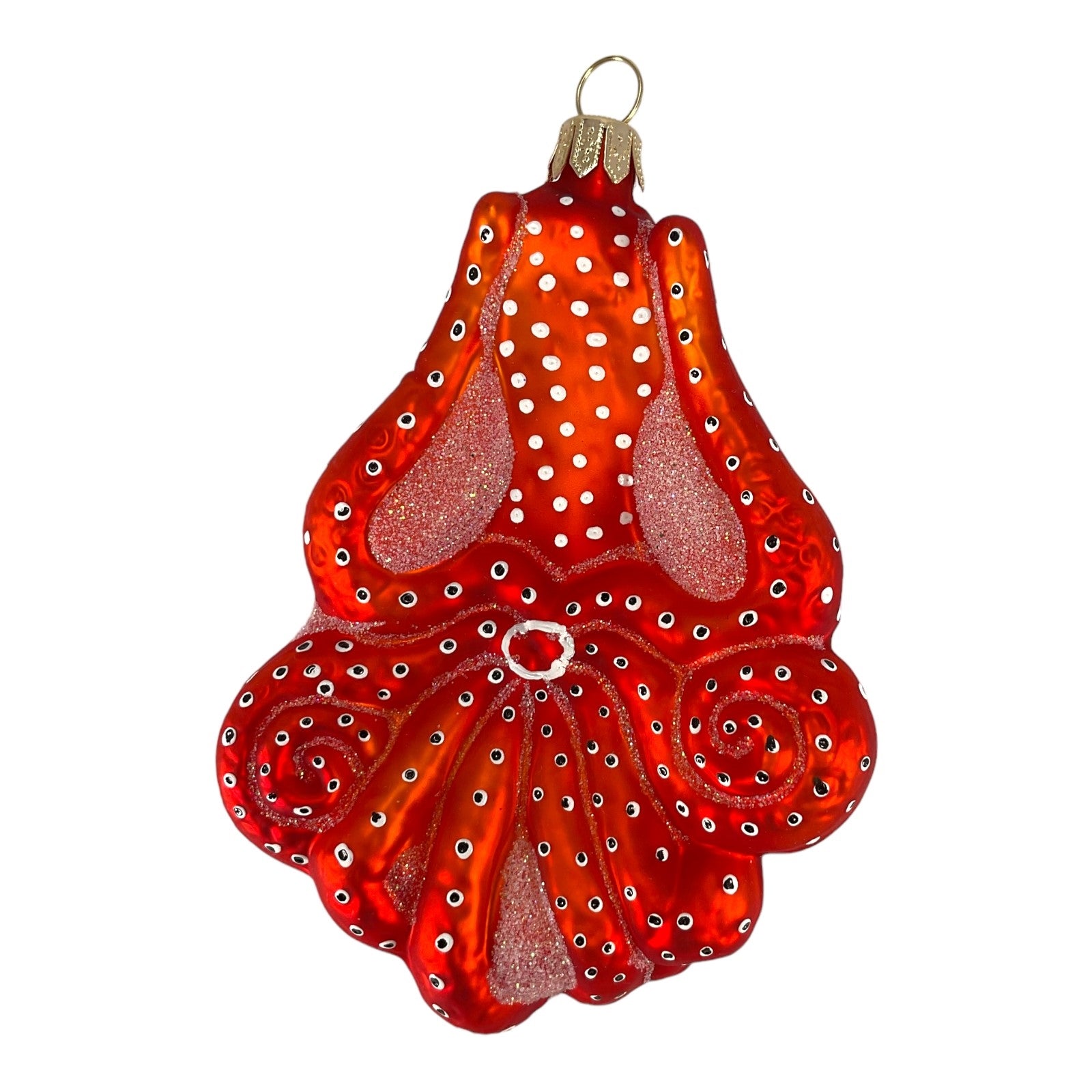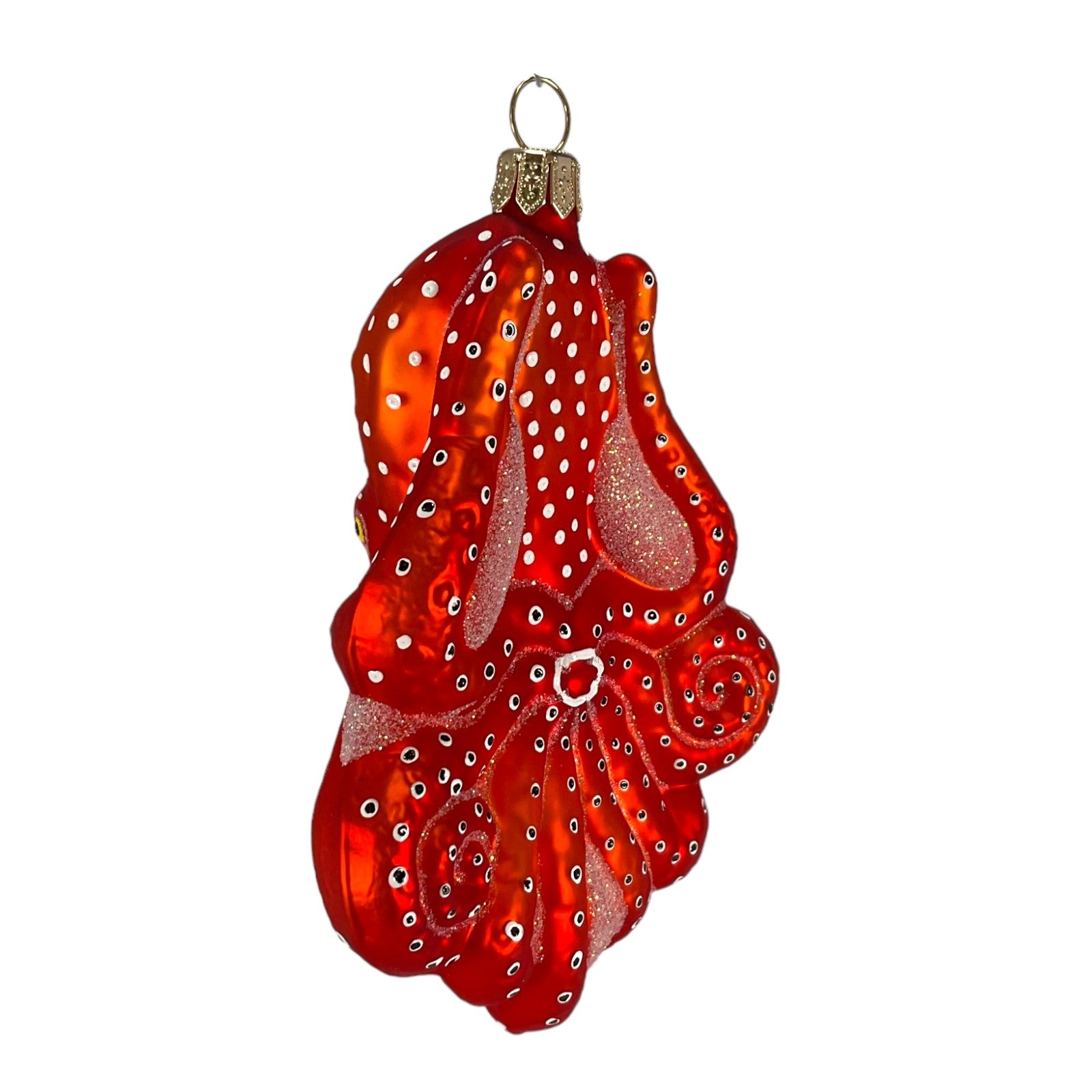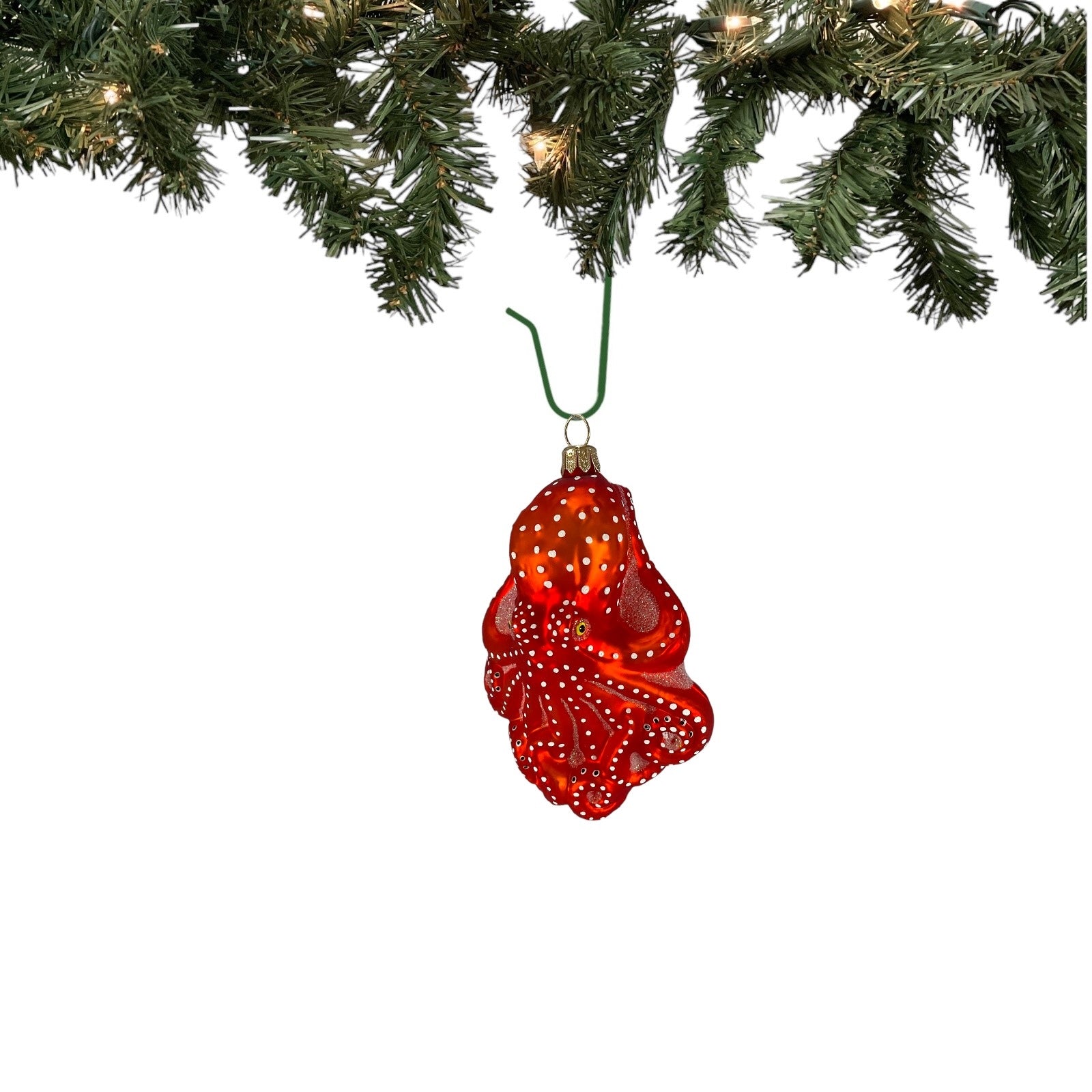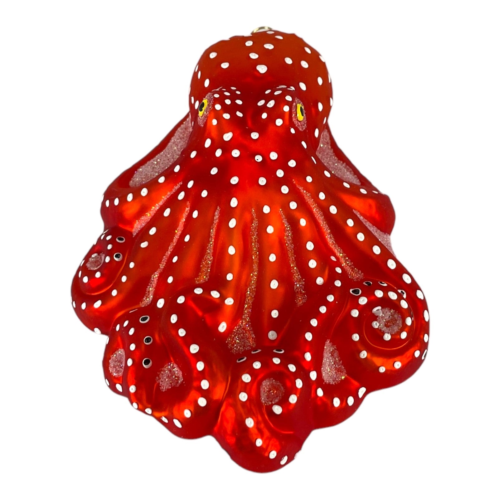 Red Octopus Ornament. Handcrafted in Poland. Hand-painted by Polish artisans. Made from mouth blown glass. Approximately 4.25 inches tall (11 cm). Approximately 3 inches long (8 cm). Approximately 1.25 inches wide (3 cm). Comes packaged in a gift box. Imported by Pinnacle Peak Trading Company. This ornament is a great way to showcase your love for sea creatures and add some personality to your Christmas tree. The octopus design is sure to delight both children and adults alike.
