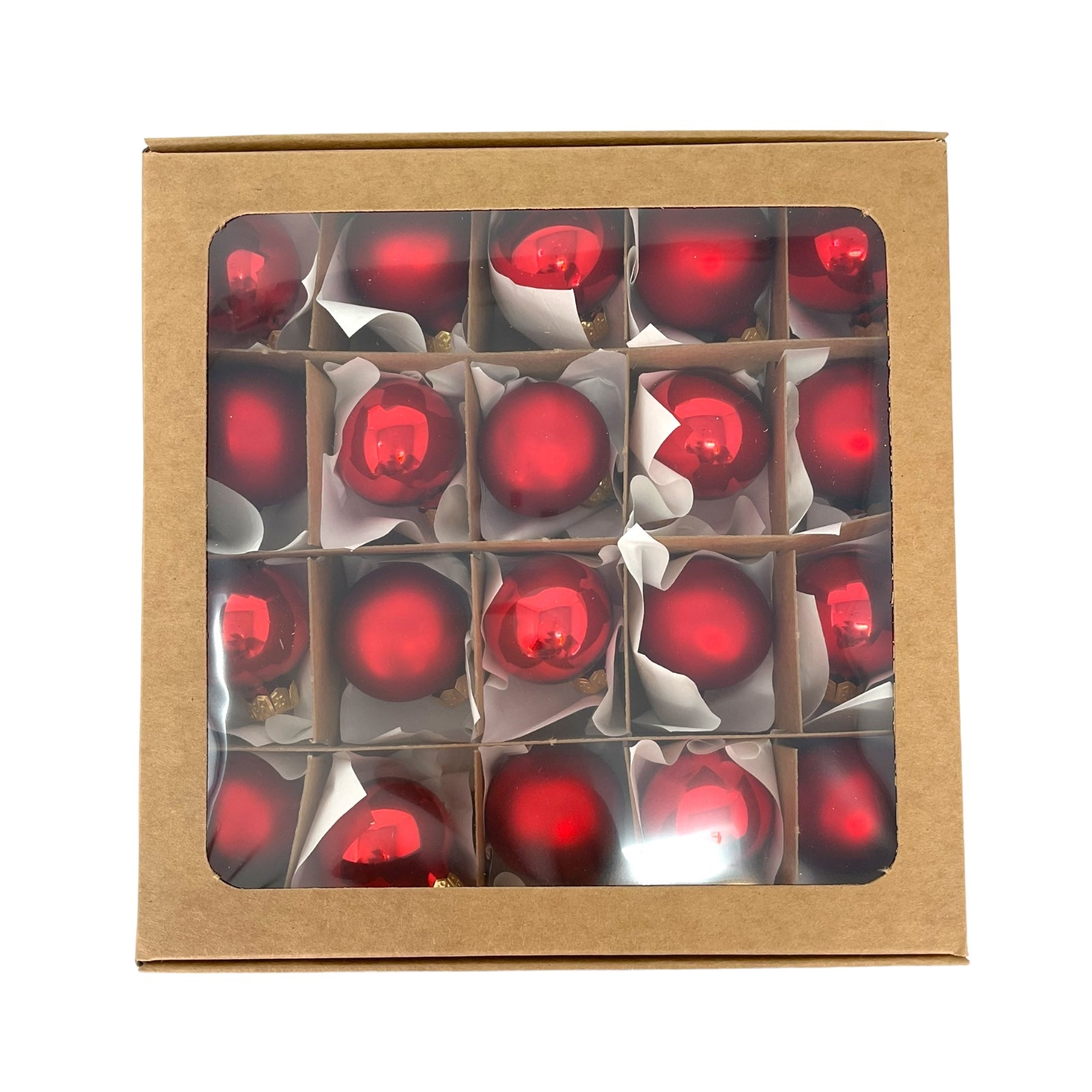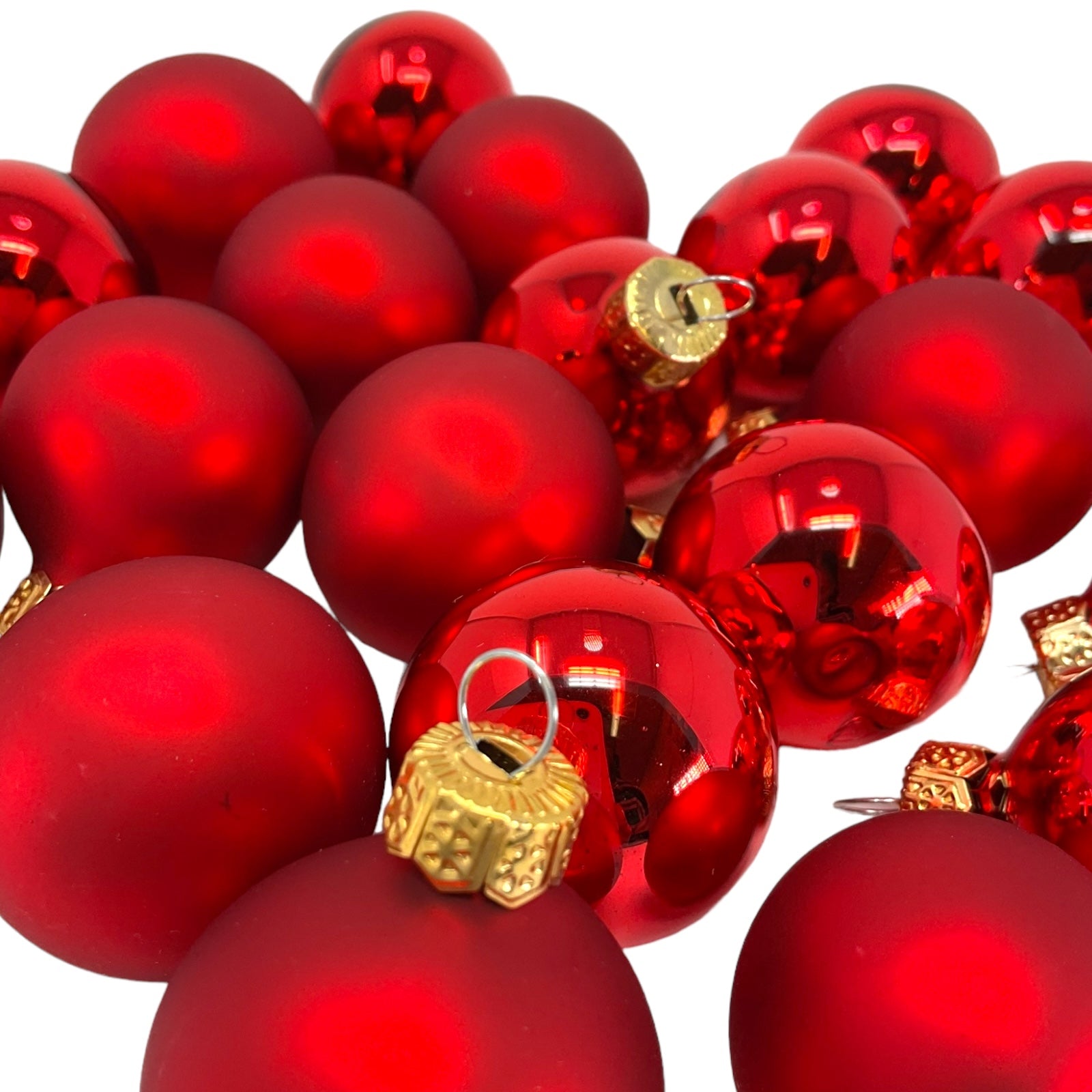 Red Christmas Ball Set. Set includes 20 ornaments - 10 matte and 10 shiny. Made in Poland. Made from glass. Balls are 30 mm in size (1.2 inch). High quality European ornament from Pinnacle Peak Trading.