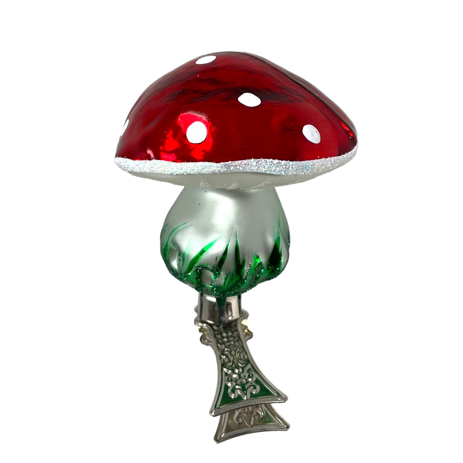 Red Mushroom Clip on Christmas Ornament. Handcrafted in Poland. Made from mouth blown glass. Hand-painted. Approximately 2 x 2 x 2.5 inches (5 x 5 x 6cm). High quality European ornament from Pinnacle Peak Trading.