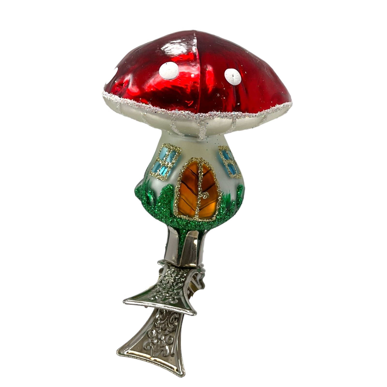 Red Mushroom House Clip on Christmas Ornament. Handcrafted in Poland. Made from mouth blown glass. Hand-painted. Approximately 2 x 2 x 2 inches (5 x 5 x 5cm). High quality European ornament from Pinnacle Peak Trading.