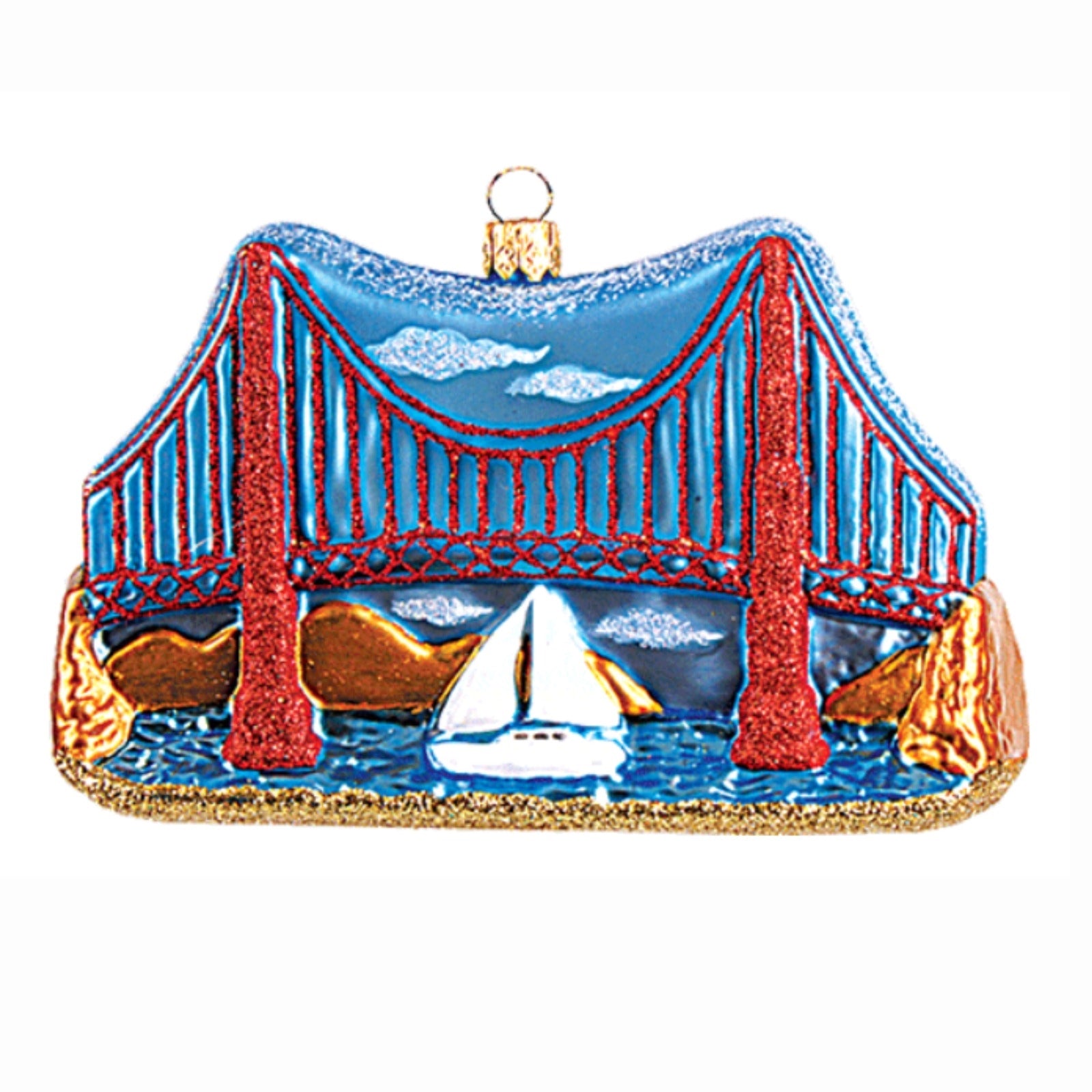 Golden Gate Bridge Ornament. Handcrafted in Poland. Hand-painted by Polish artisans. Made from mouth blown glass. Approximately 5 inches long (13 cm). Includes original Pinnacle Peak Trading box and packaging. Imported by Pinnacle Peak Trading Company.
