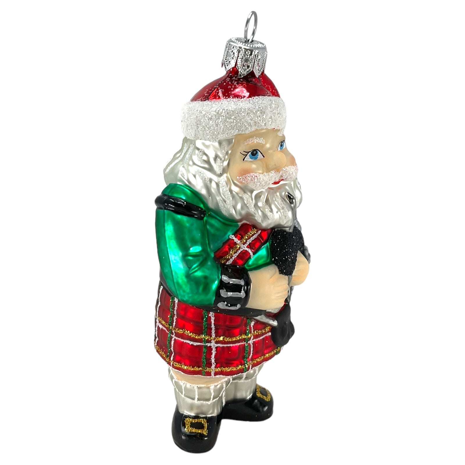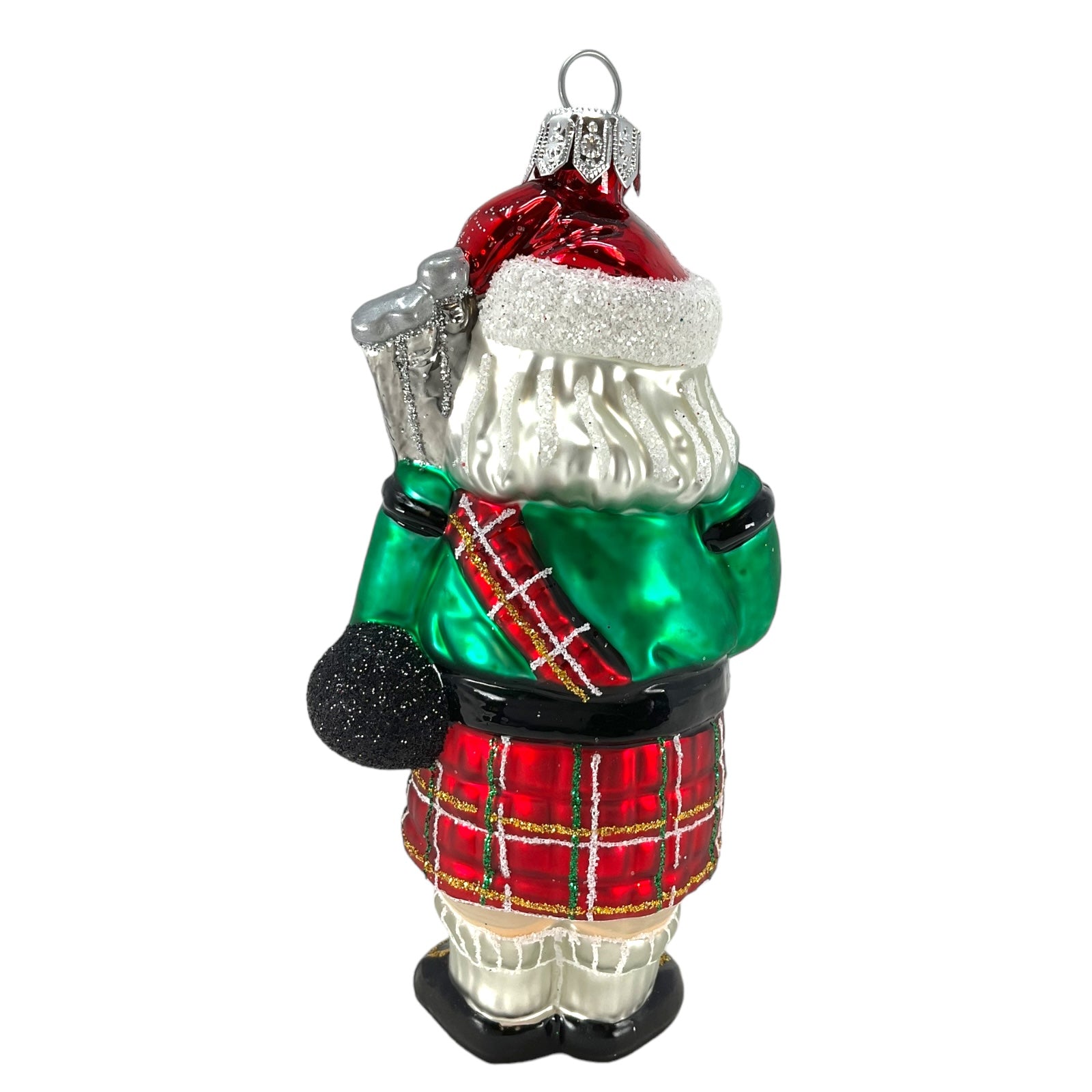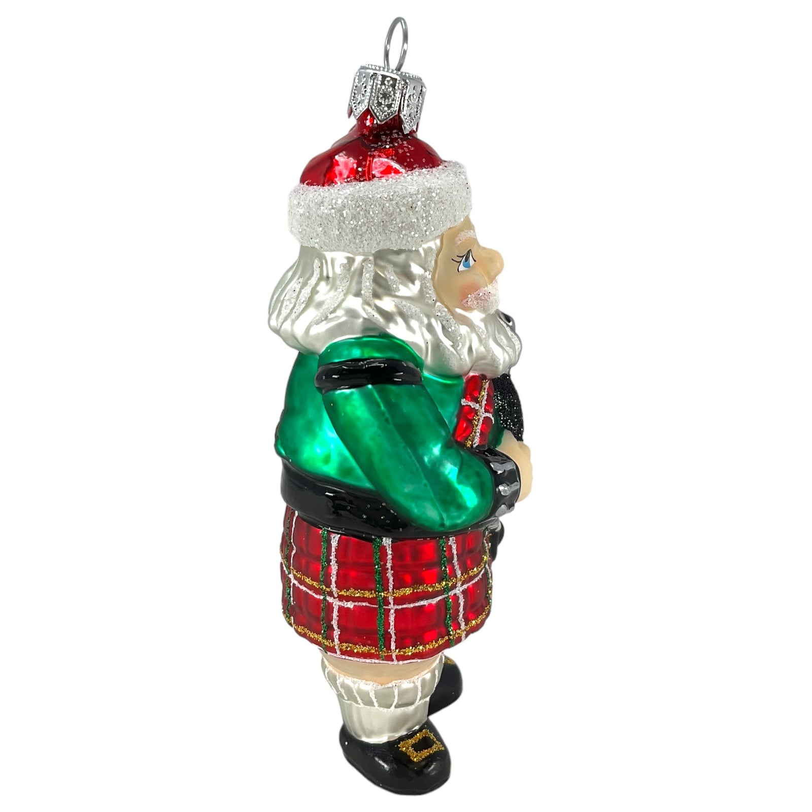 Scottish Santa Wearing Kilt Christmas Ornament. Handcrafted in Poland. Made from mouth blown glass. Hand-painted. Approximately 2.5 x 1.75 x 5 inches (6 x 4 x 13cm). High quality European ornament from Pinnacle Peak Trading.