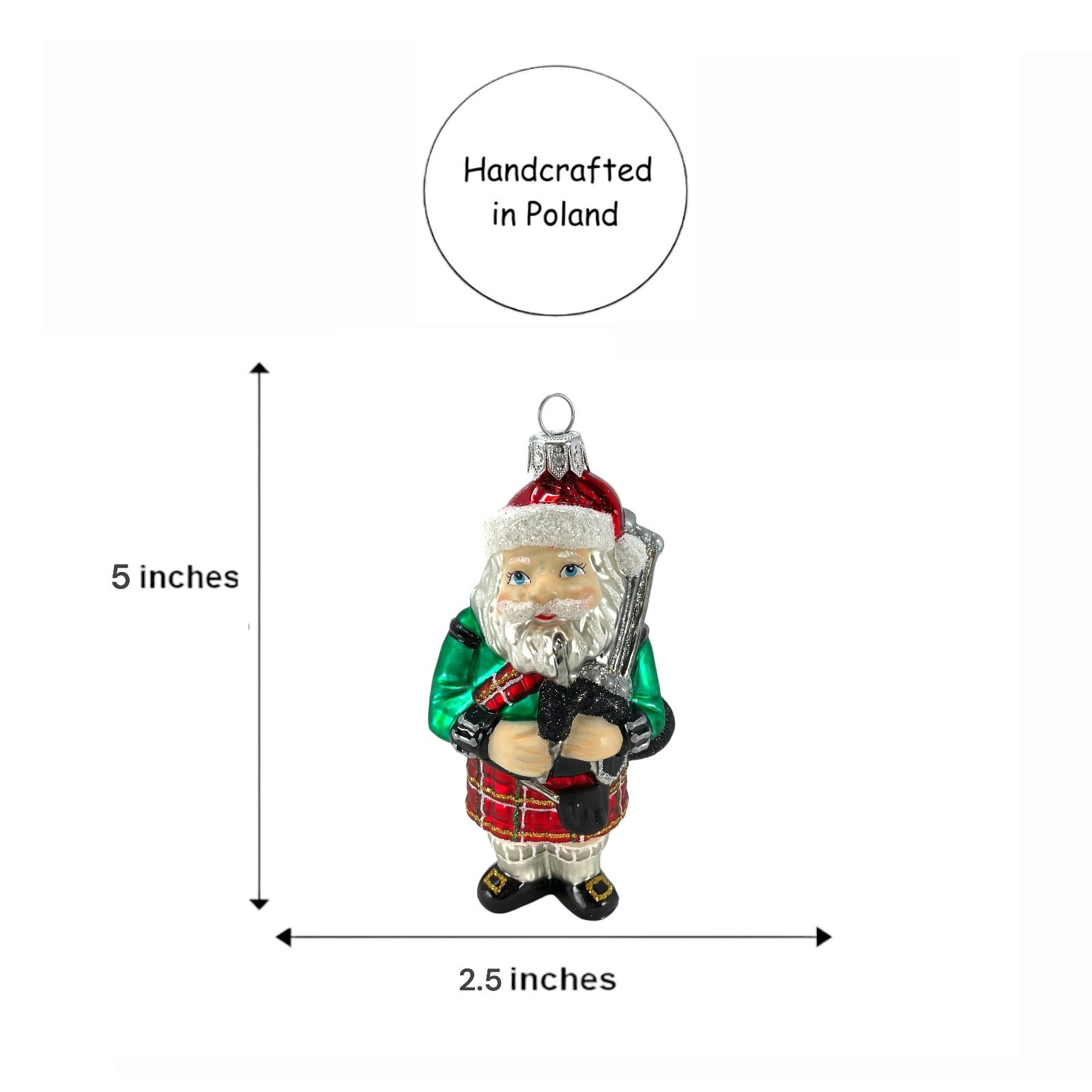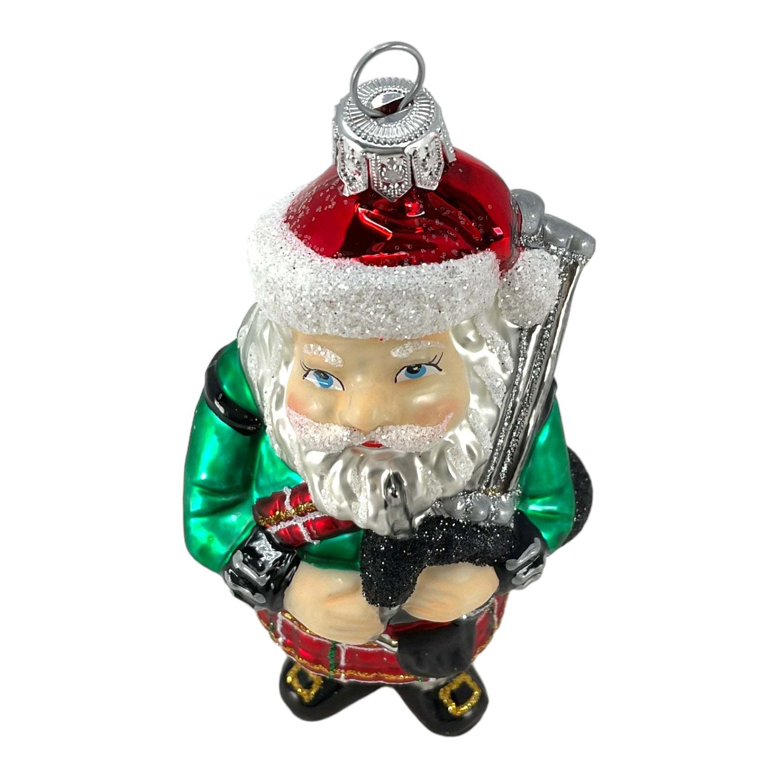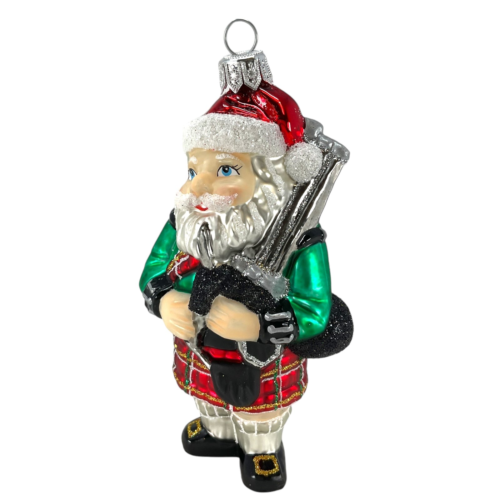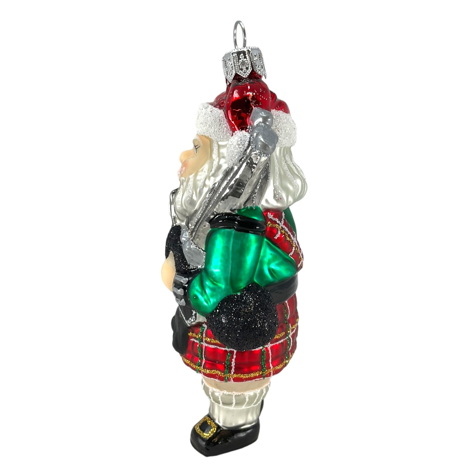 Scottish Santa Wearing Kilt Christmas Ornament. Handcrafted in Poland. Made from mouth blown glass. Hand-painted. Approximately 2.5 x 1.75 x 5 inches (6 x 4 x 13cm). High quality European ornament from Pinnacle Peak Trading.