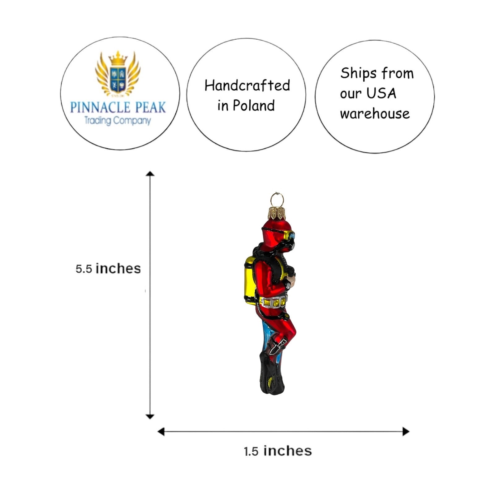 Scuba Diver Ornament. Handcrafted in Poland. Hand-painted by Polish artisans. Made from mouth blown glass. Approximately 5.5 inches tall. Includes original Pinnacle Peak Trading box and packaging. Imported by Pinnacle Peak Trading Company.