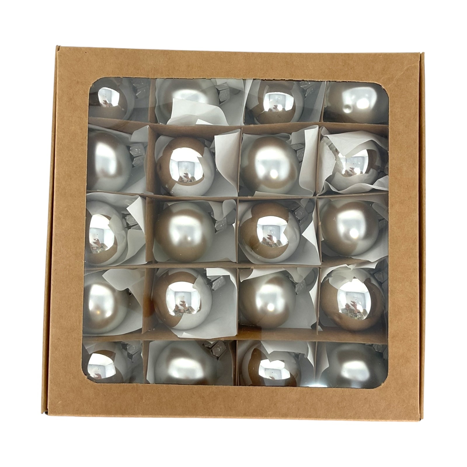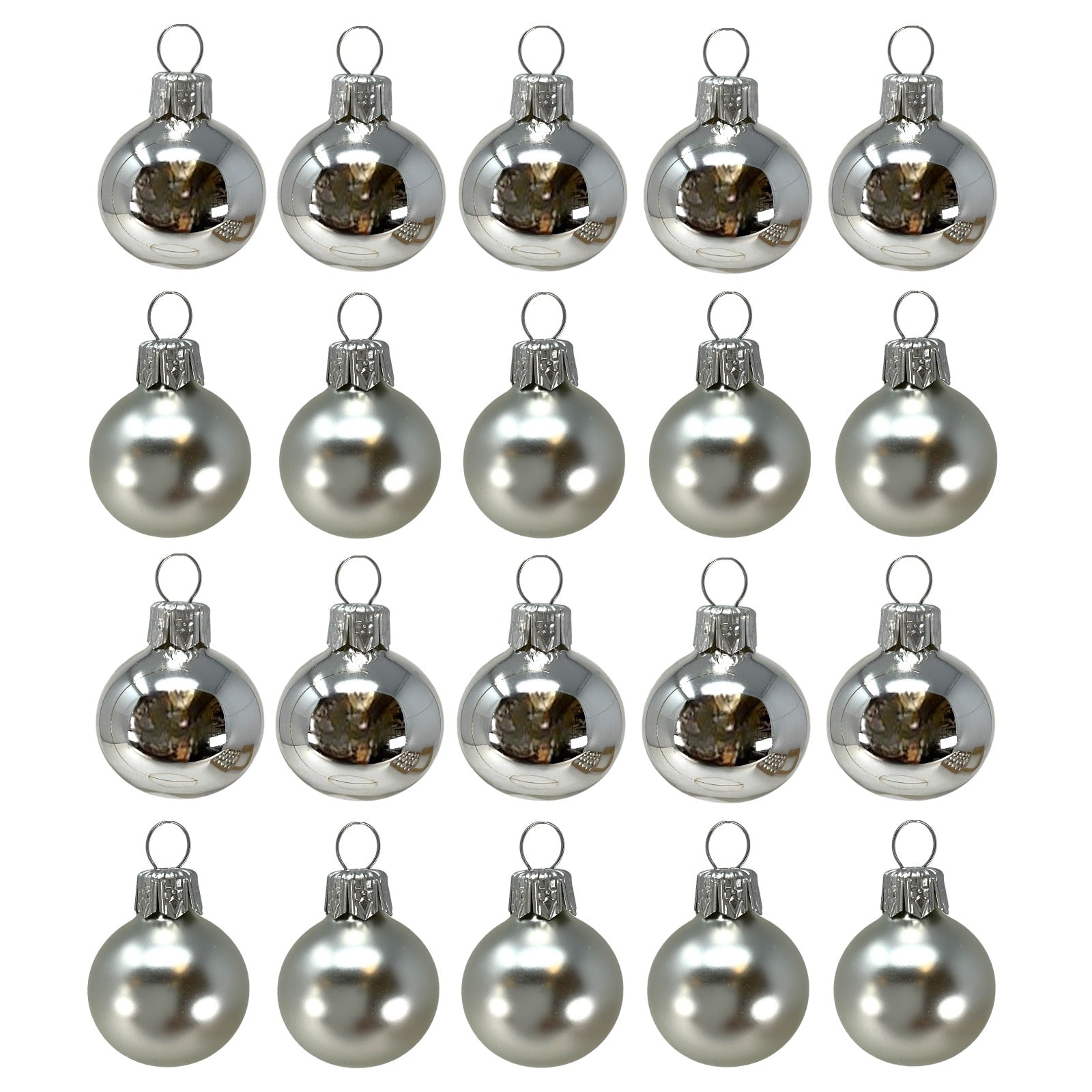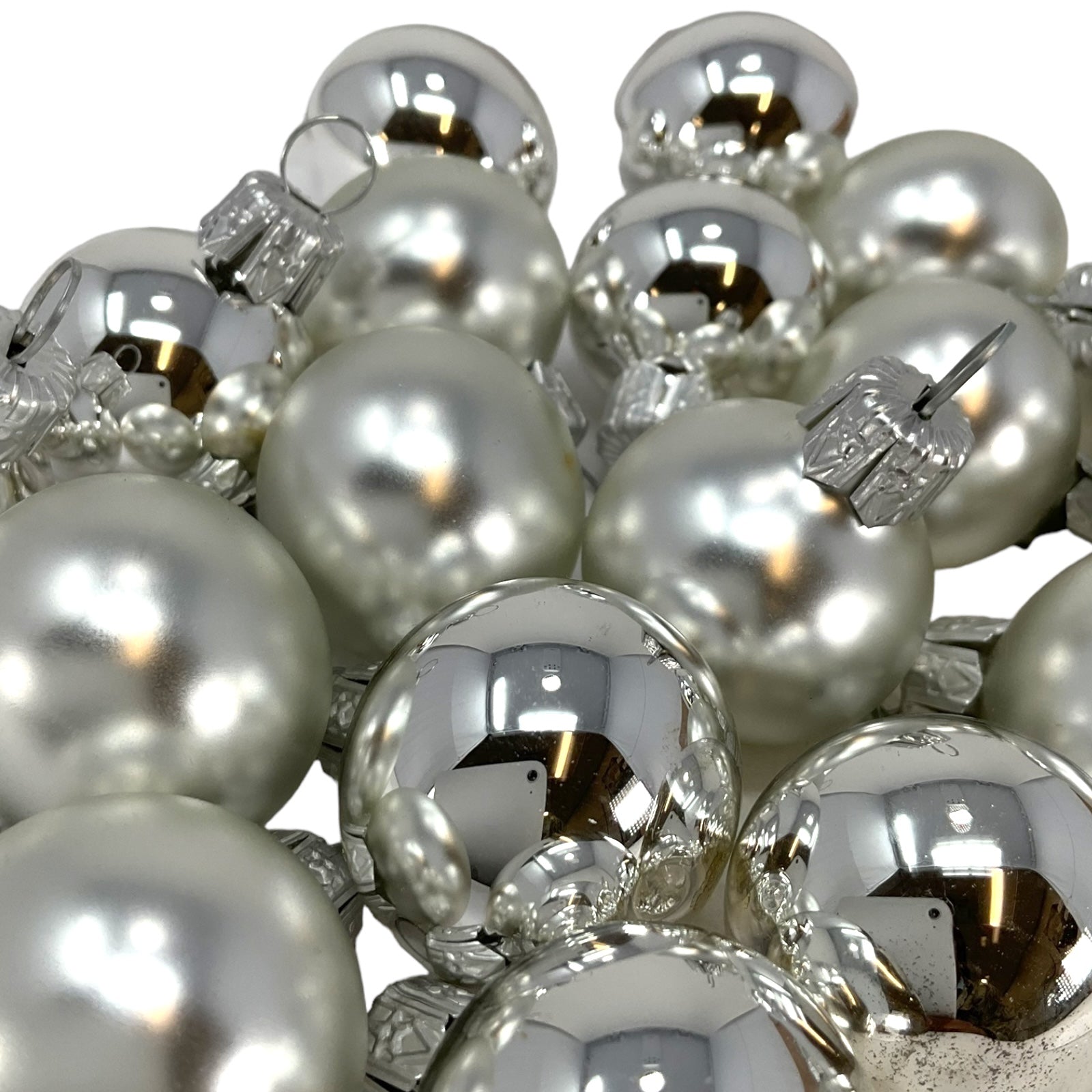 Silver Christmas Ball Set. Set includes 20 ornaments - 10 matte and 10 shiny. Made in Poland. Made from glass. Balls are 30 mm in size (1.2 inch). High quality European ornament from Pinnacle Peak Trading.