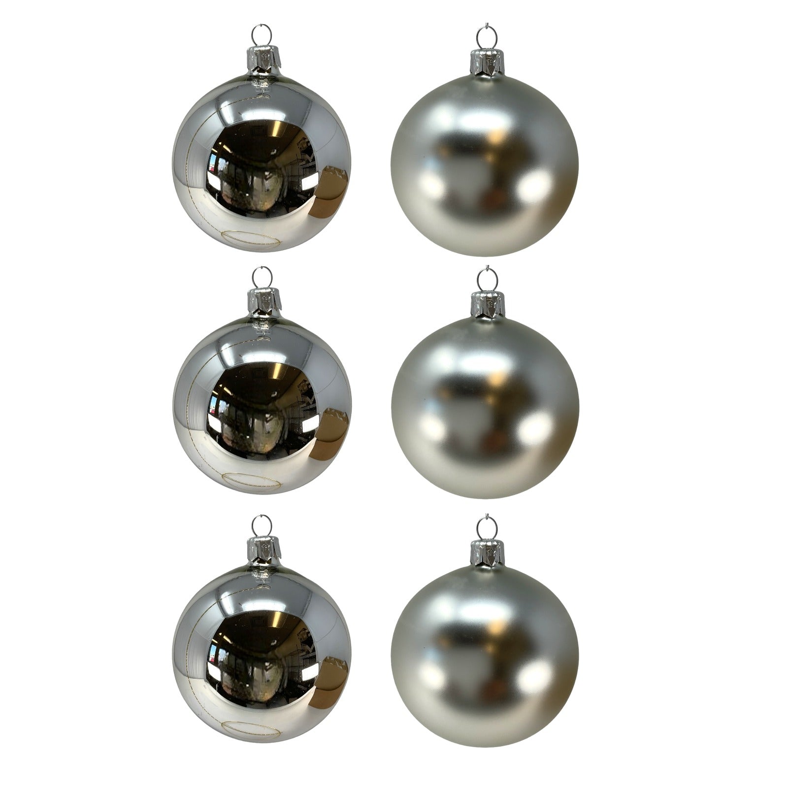 Silver Christmas Ball Set. Set includes 6 ornaments - 3 matte and 3 shiny. Made in Poland. Made from glass. Balls are 80 mm in size (3.1 inch). High quality European ornament from Pinnacle Peak Trading.