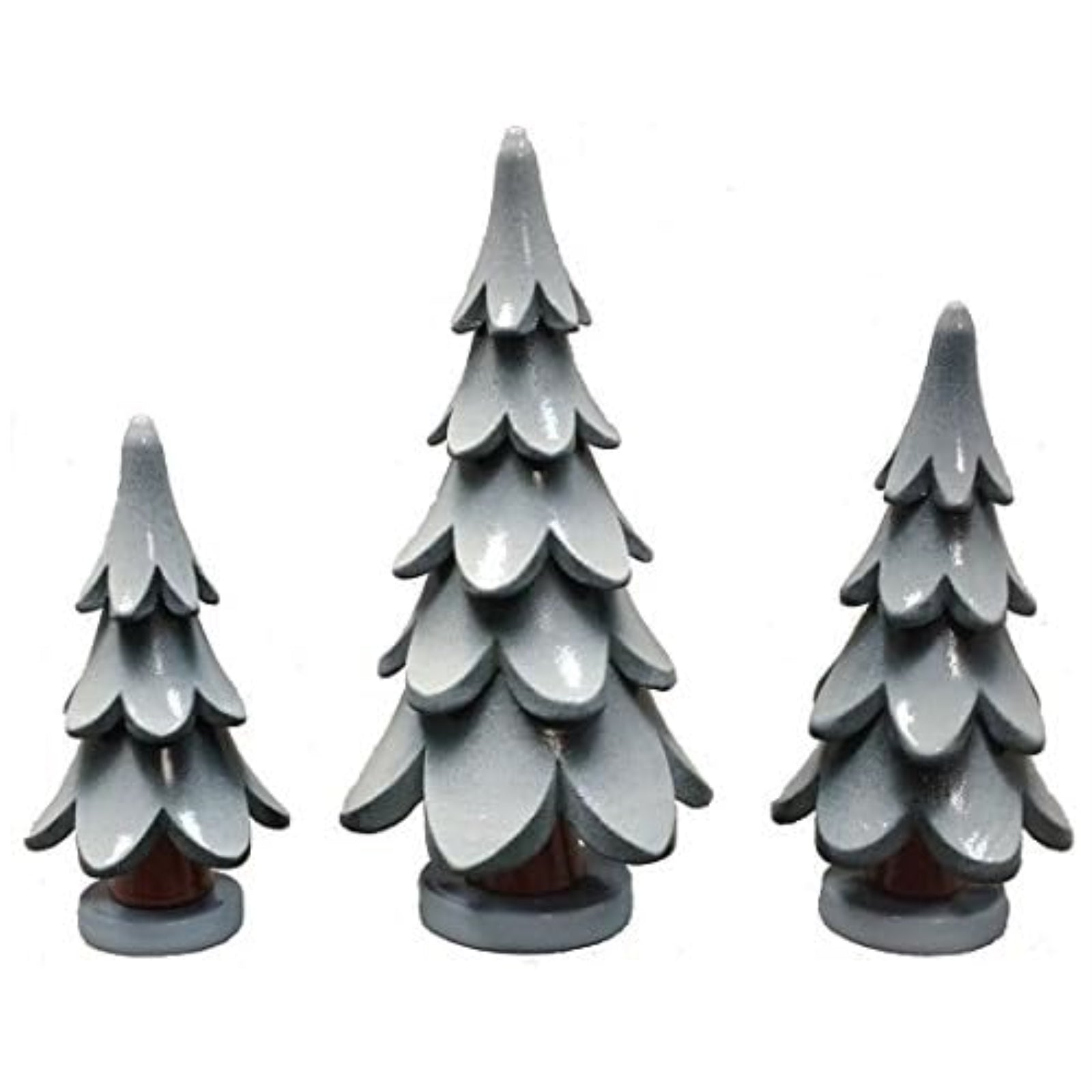 Snow Covered Tree Figurines. Set of three. Handcrafted in the Erzgebirge region of Germany. Made from wood. Set ranges from approximately 2-4.5 inches tall (5-11 cm). Includes original manufacturers box and packaging. Imported by Pinnacle Peak Trading Company.