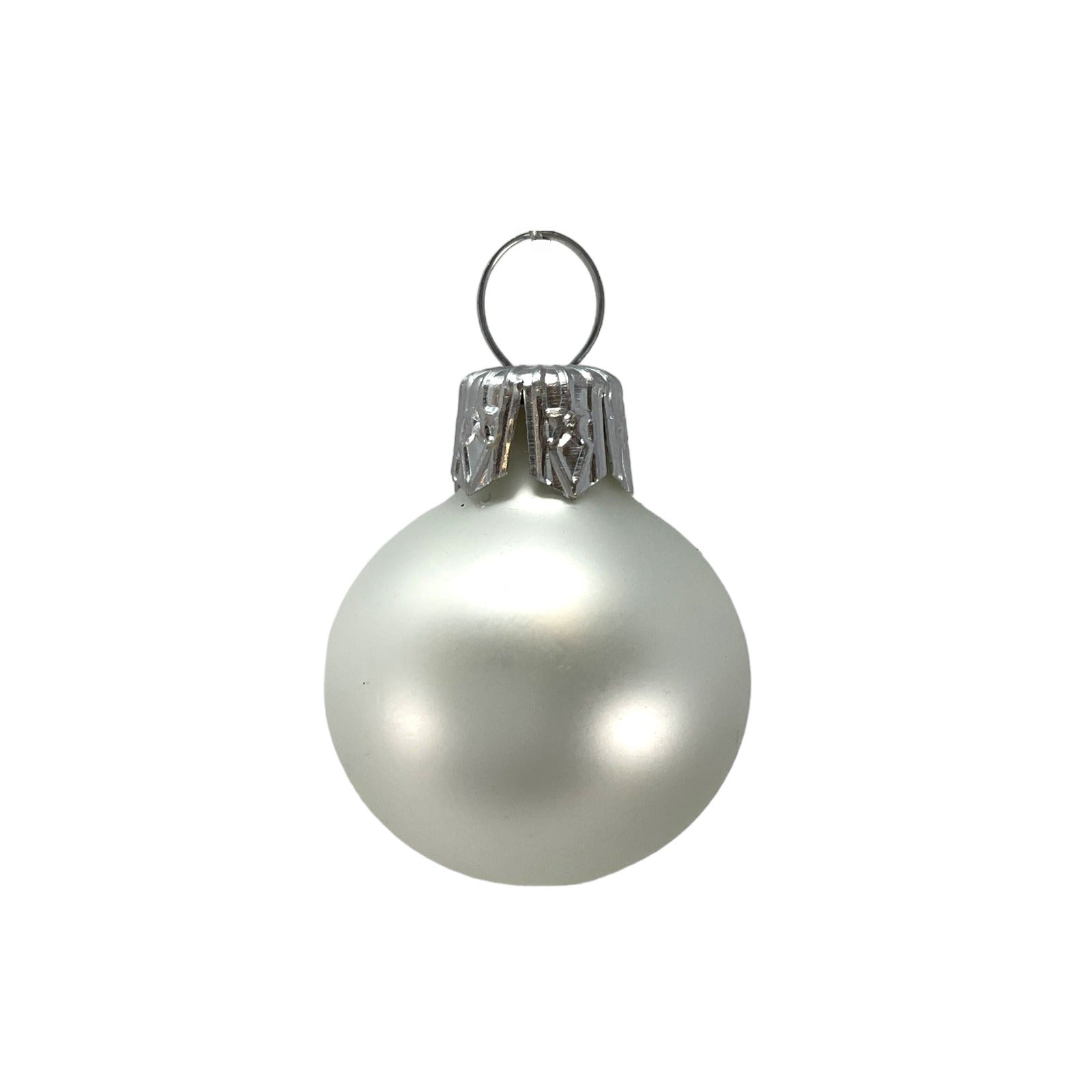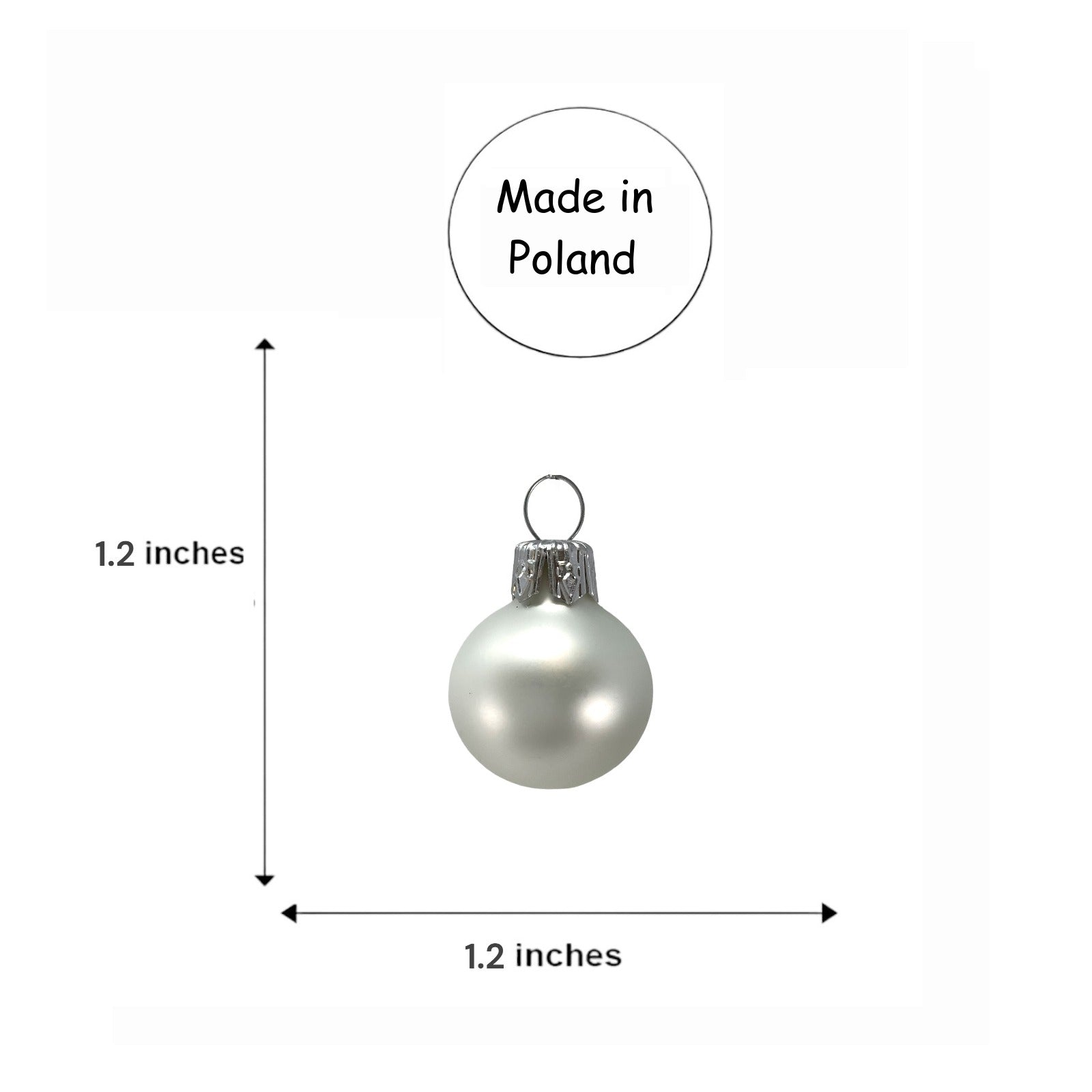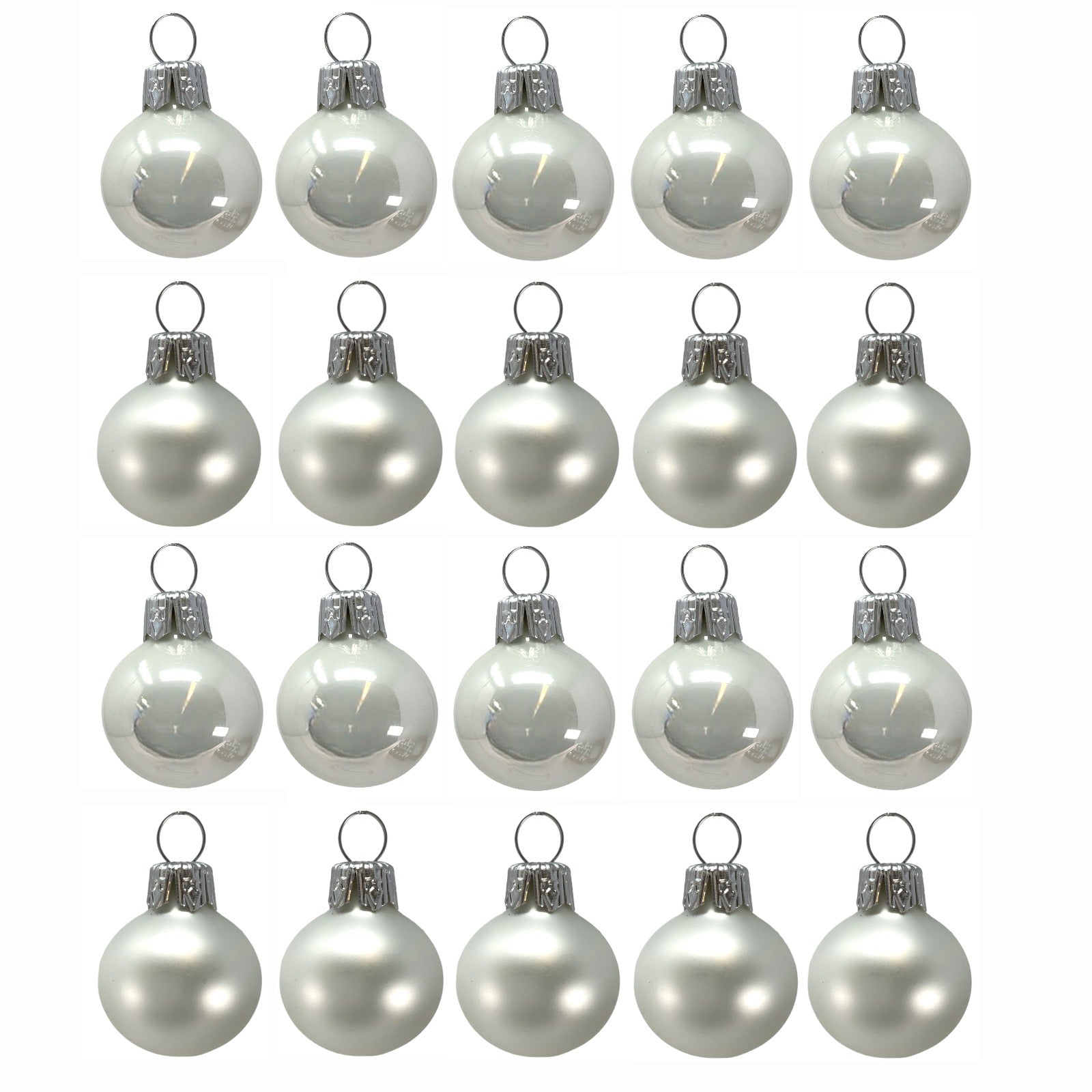 White Christmas Ball Set. Set includes 20 ornaments - 10 matte and 10 shiny. Made in Poland. Made from glass. Balls are 30 mm in size (1.2 inch). High quality European ornament from Pinnacle Peak Trading.