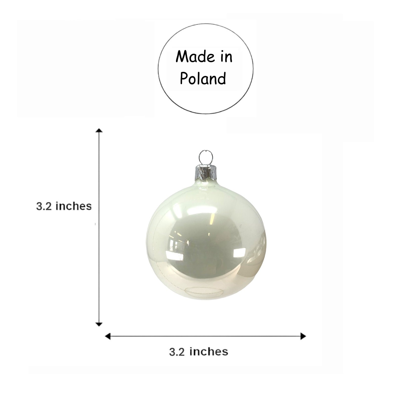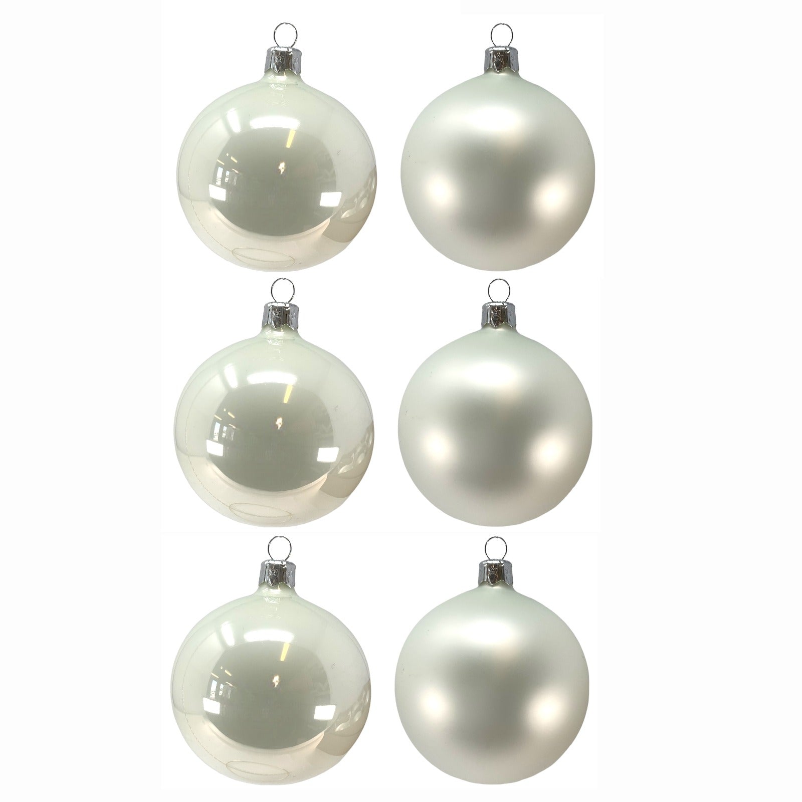 White Christmas Ball Set. Set includes 6 ornaments - 3 matte and 3 shiny. Made in Poland. Made from glass. Balls are 80 mm in size (3.1 inch). High quality European ornament from Pinnacle Peak Trading.