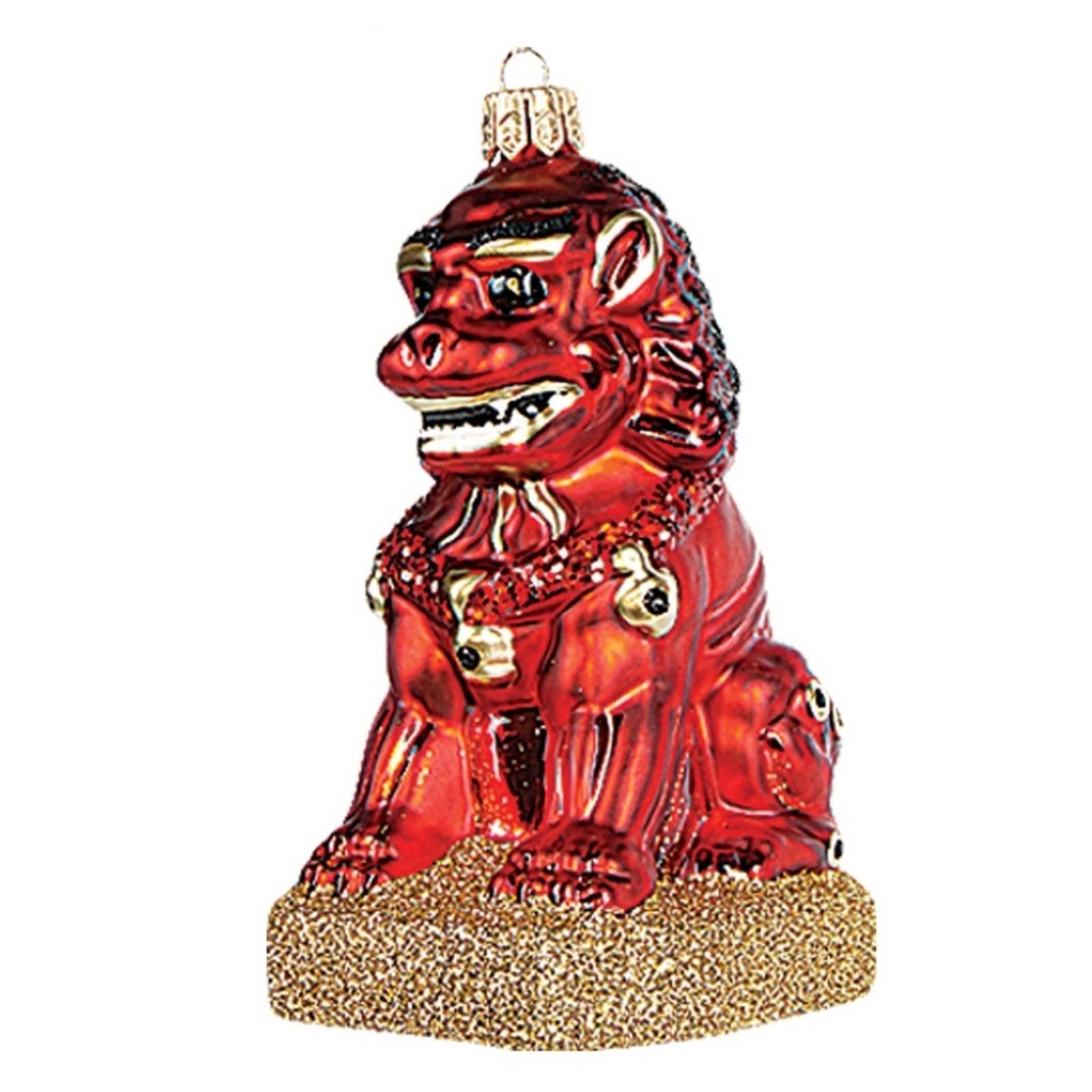 Red Guardian Lion Ornament. Handcrafted in Poland. Hand painted by Polish artisans. Made from mouth blown glass. Approximately 4 inches tall (11cm). Comes packaged in a gift box. Imported by Pinnacle Peak Trading Company.