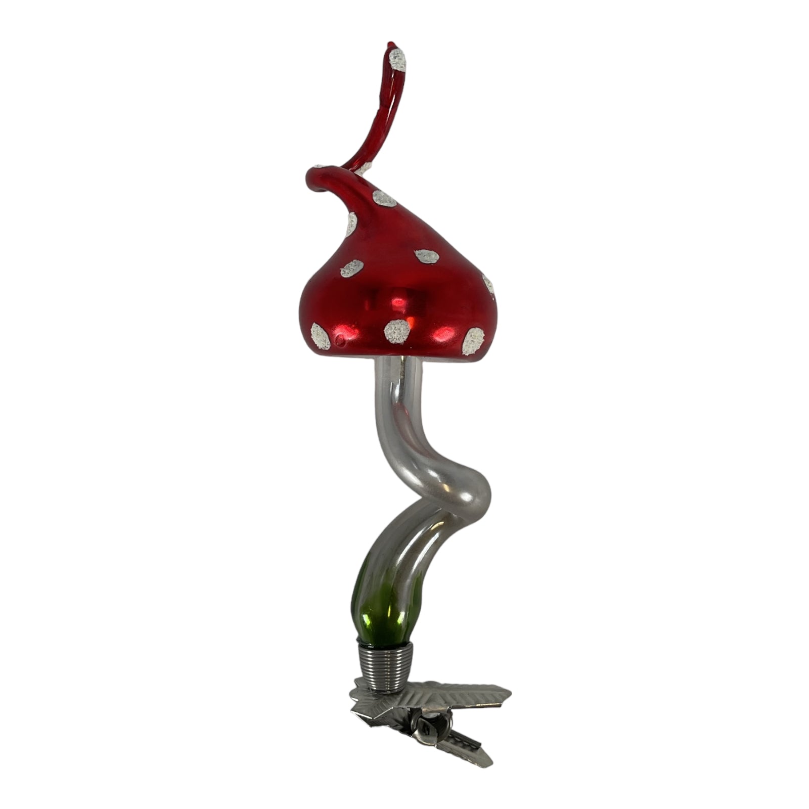 Red Toadstool Mushroom with Twisted Top Christmas Tree Ornament. Handcrafted in Germany. Hand-painted by German artisans. Made from glass. Approximately 5 inches tall x 1 inch long x 1 inch wide (12.7 x 2.5 cm). Imported by Pinnacle Peak Trading Company