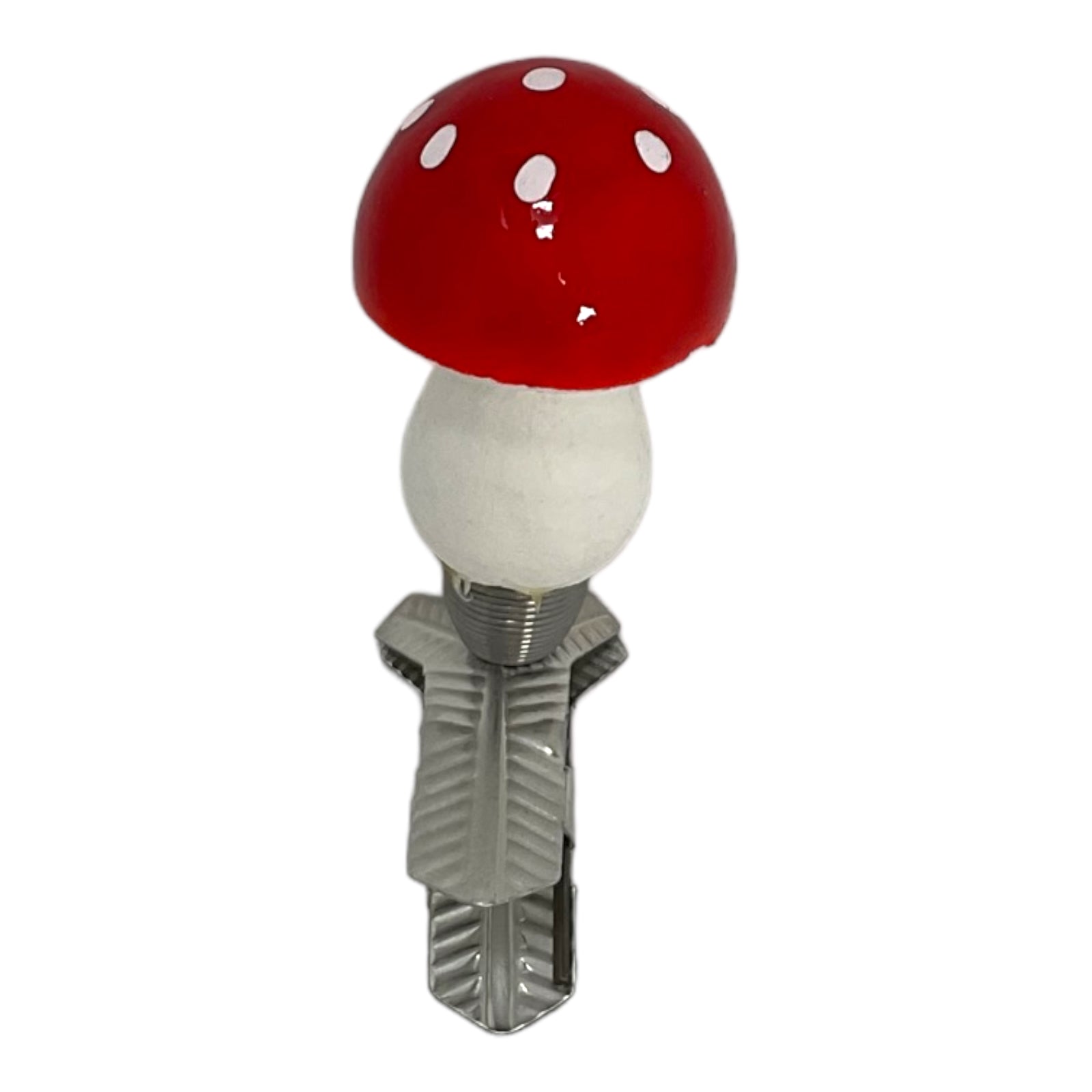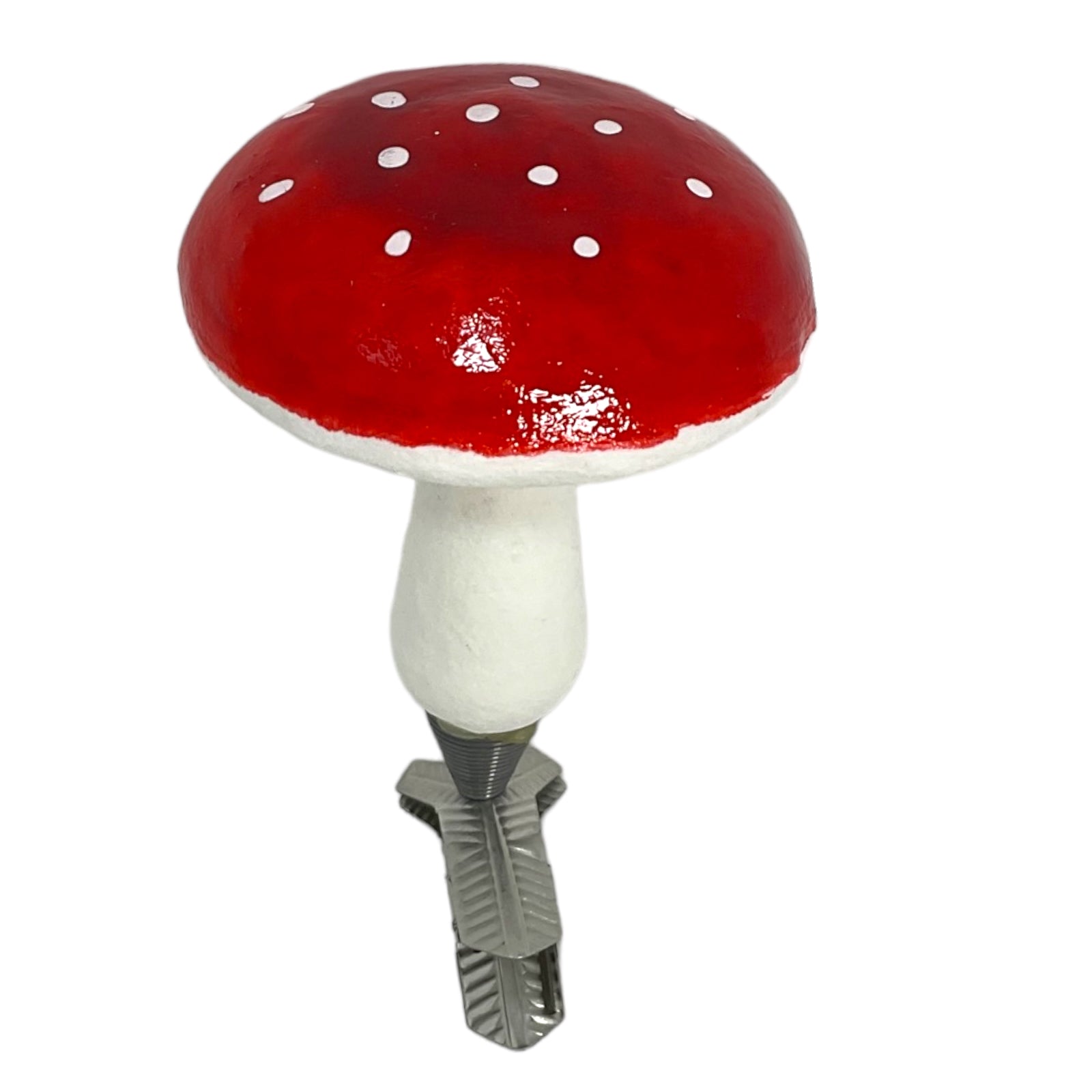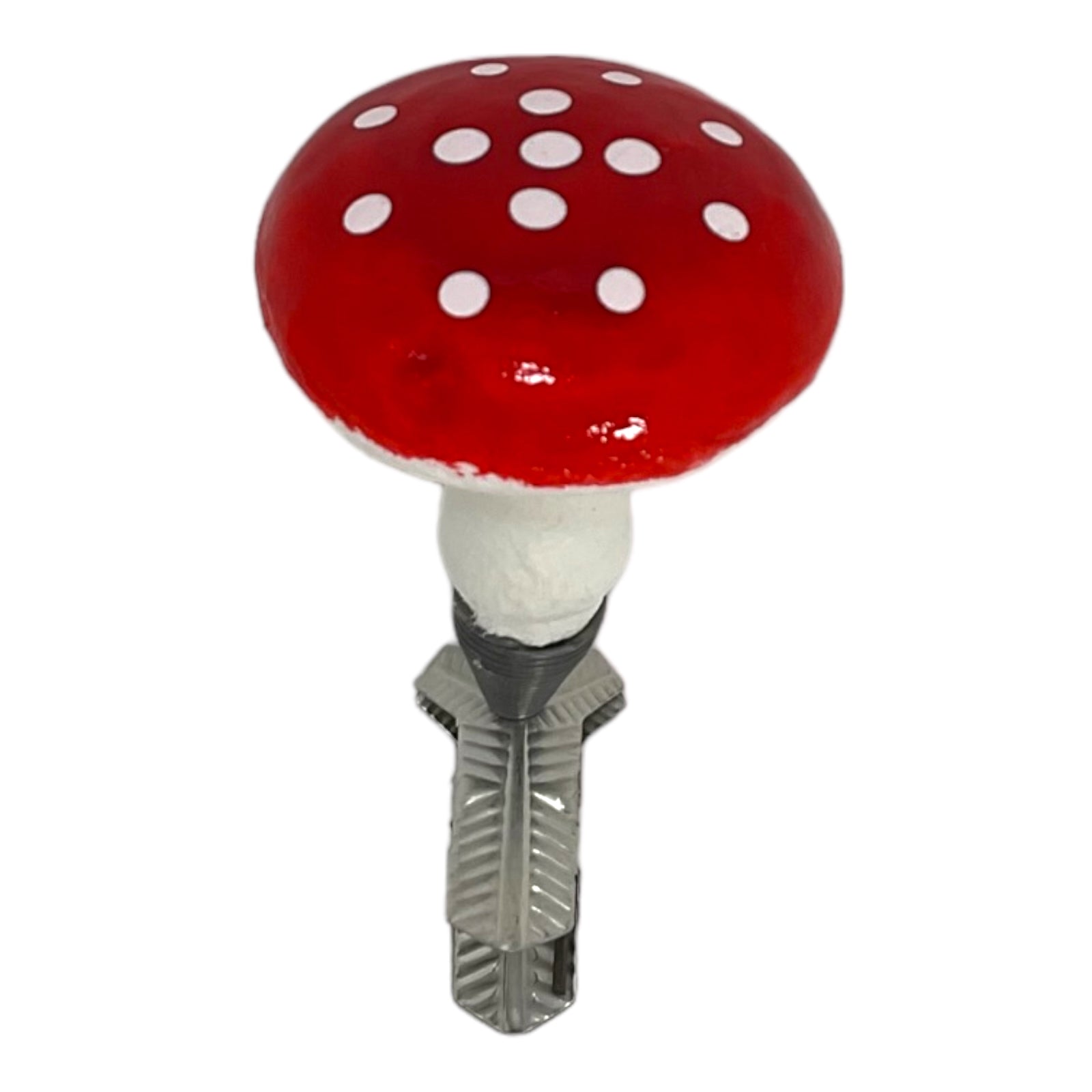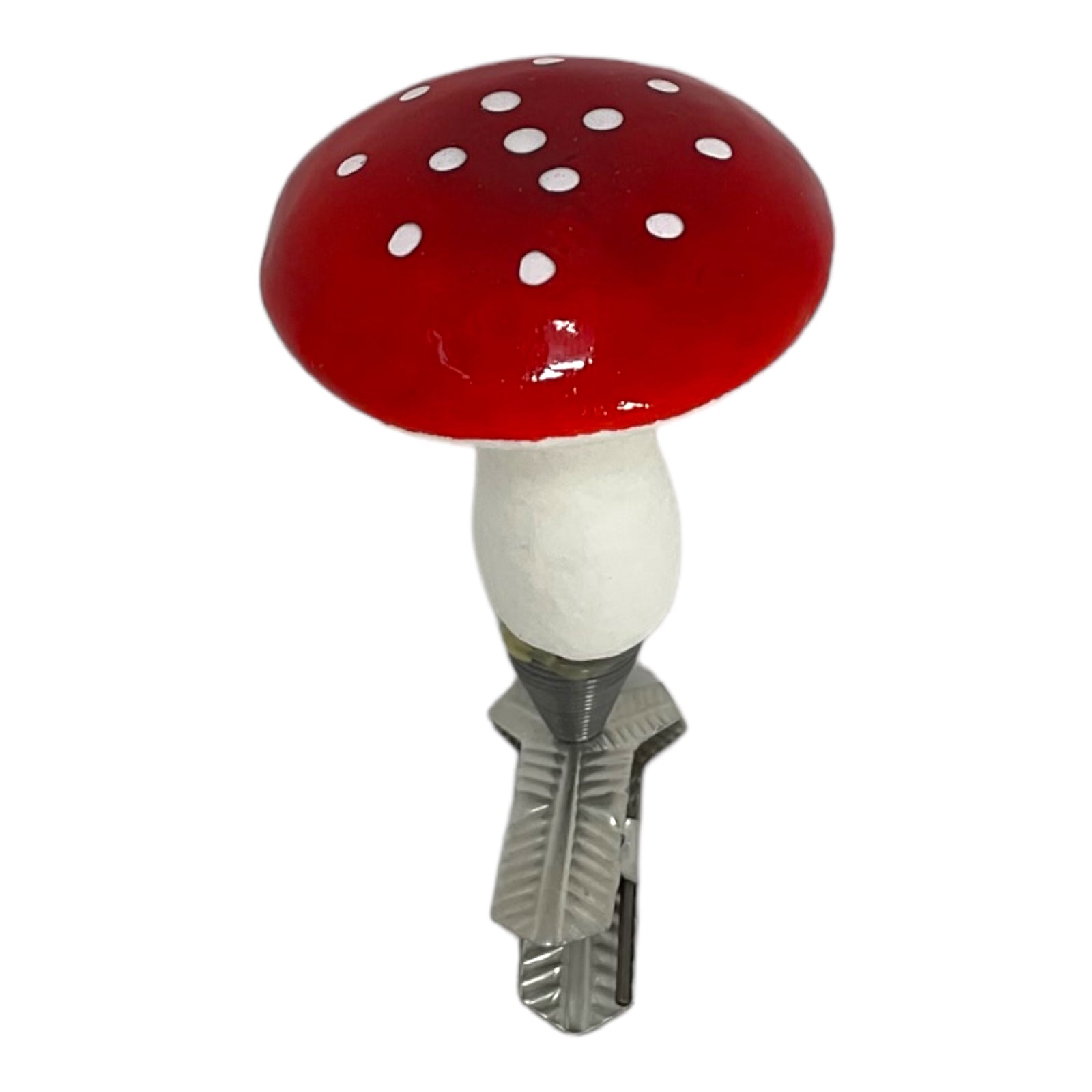Red Mushroom Clip On Christmas Tree Ornaments. Set of 4 mushrooms. Handcrafted in Germany. Hand-painted my German artisans. Made from paper mache. Mushrooms are approximately 3 to 1.5 inches tall and 1.5 to .5 inches long. Imported by Pinnacle Peak Trading Company