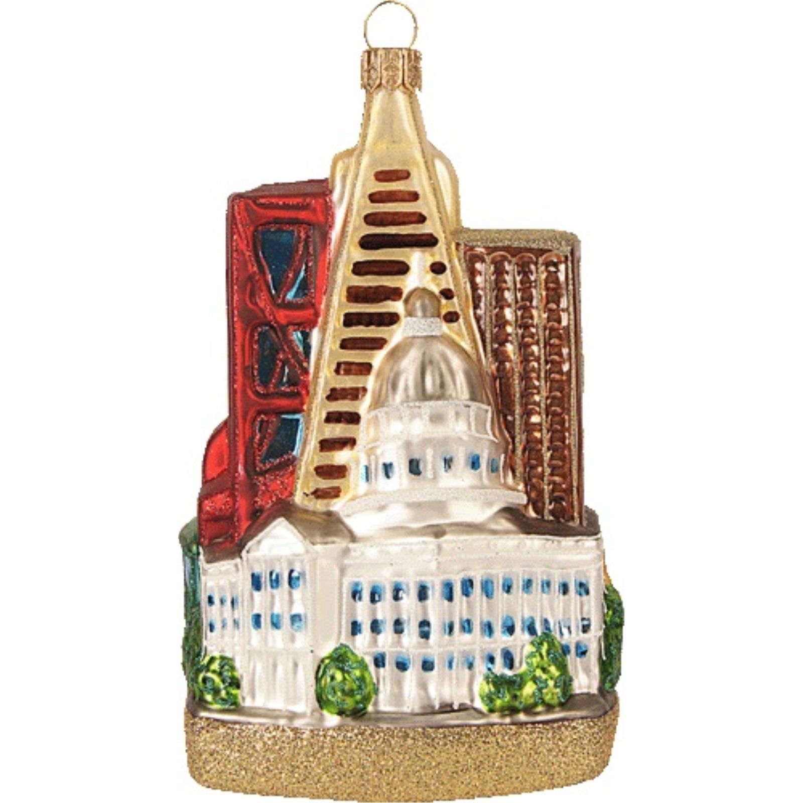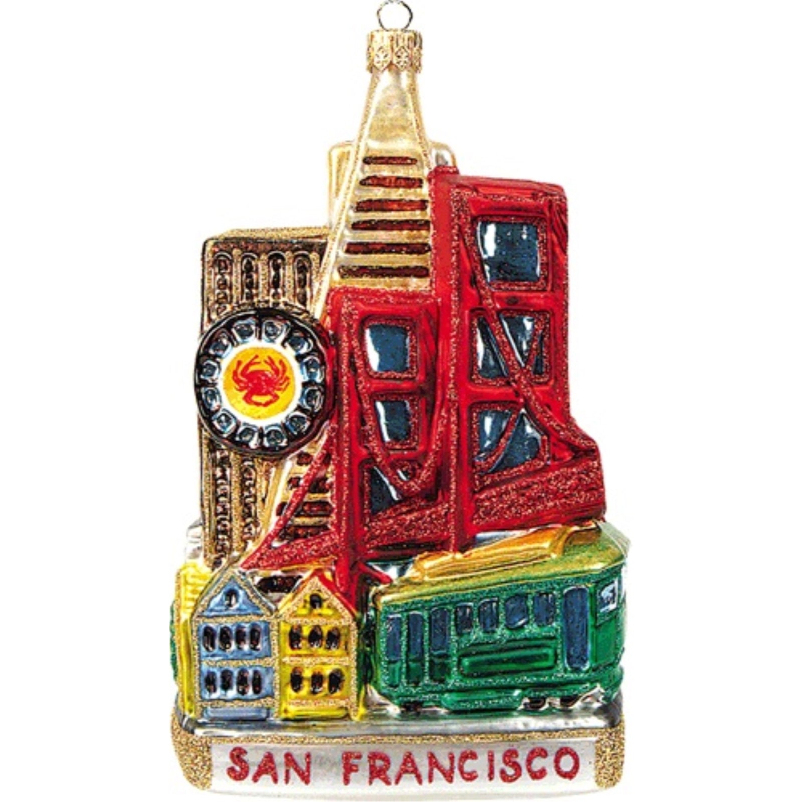 San Francisco Landscape Ornament. Handcrafted in Poland. Hand-painted by Polish artisans. Made from mouth blown glass. Approximately 5 inches tall (13 cm). Includes original Pinnacle Peak Trading box and packaging. Imported by Pinnacle Peak Trading Company.