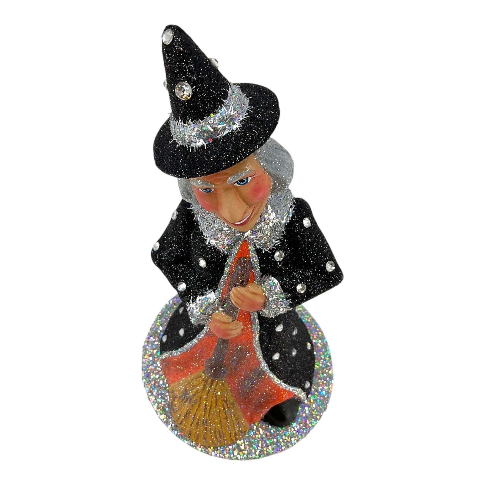 - This specific piece features a Witch dressed in a black glitter outfit with crystals holding a broom.