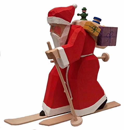Carved Skiing Santa Claus Figurine. Handcrafted in the Erzgebirge region of Germany. Made from wood. Approximately 5.3 inches tall (13.5cm). Includes original manufacturers box and packaging. Imported by Pinnacle Peak Trading Company.