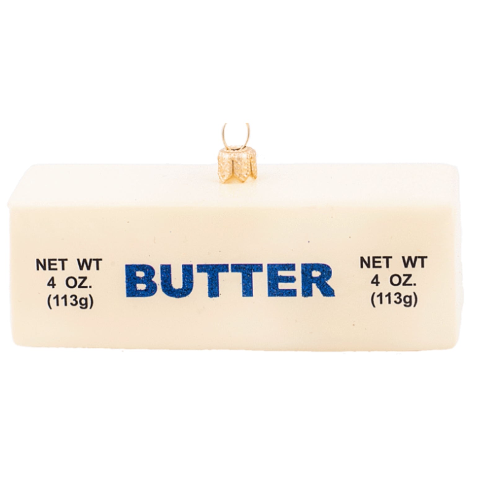 Stick of butter Ornament. Handcrafted in Poland. Hand-painted by Polish artisans. Made from mouth blown glass. Approximately 1.7 x 4.0 x 1.3 inches. Includes original Pinnacle Peak Trading box and packaging. Imported by Pinnacle Peak Trading Company.