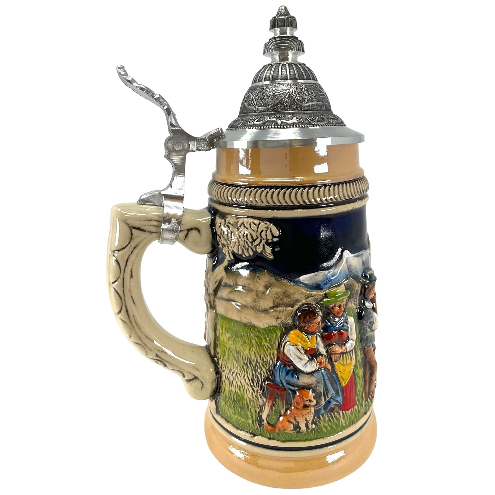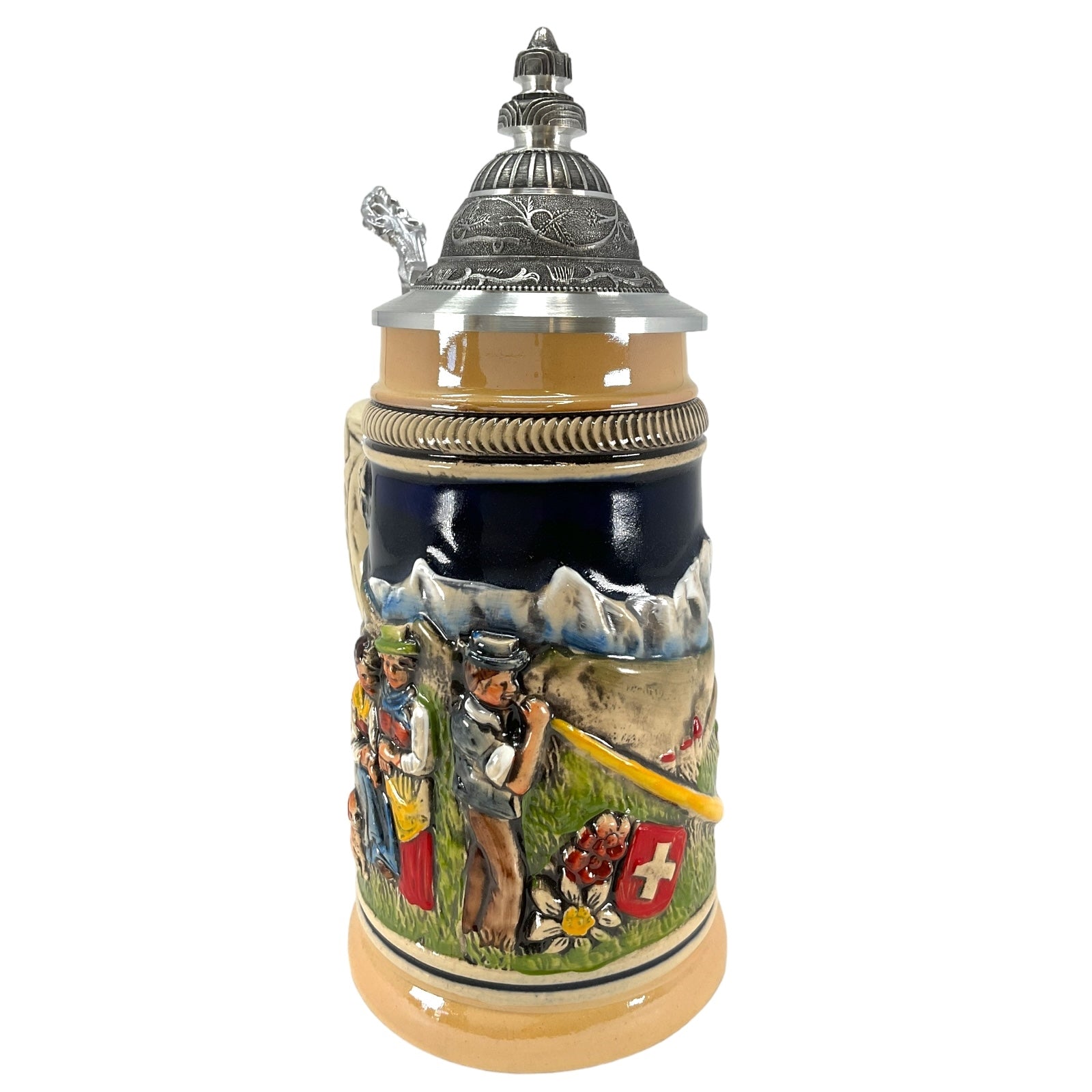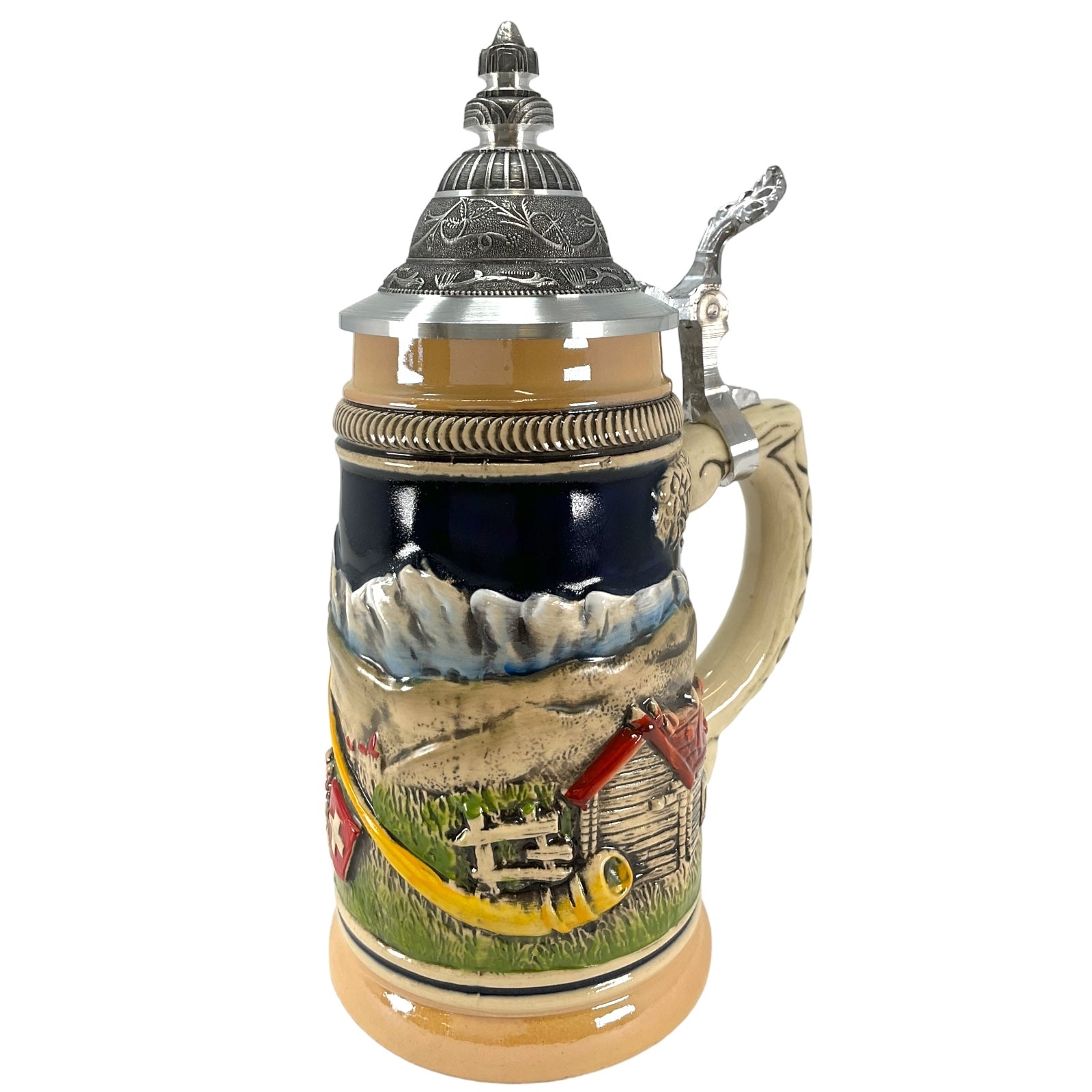 This beautiful stoneware beer stein was handcrafted in Germany by Zoeller & Born. . This attractive stein has a pewter lid. . The handpainted stoneware relief shows a Swiss horn blower in the Swiss Alps. . One side has a farm building and the other side has two women with their dog. . This 1/4 liter stein is about 8 inches tall. . Zoeller and Born is a family owned operation that has been producing high quality beer steins since 1956. They specialize in steins with stunning handpainted relief. Zoeller and Born is one of only a few remaining German stein companies that still produce their steins in Germany with 100% German materials and German labor..