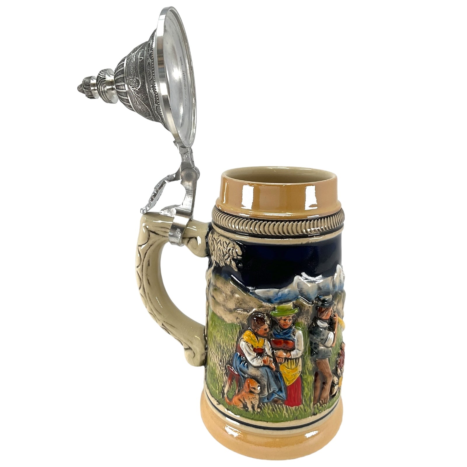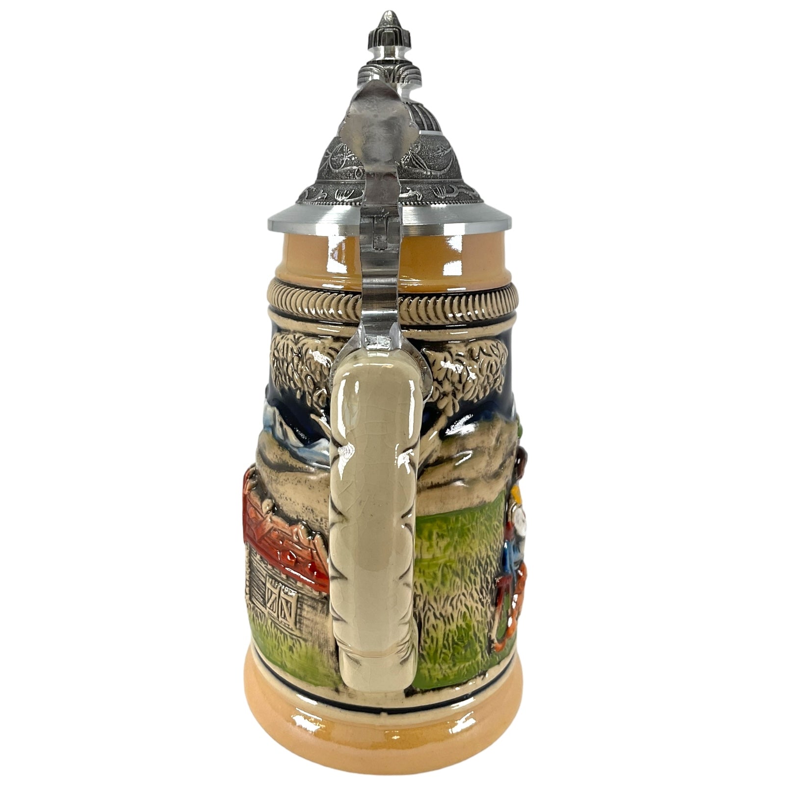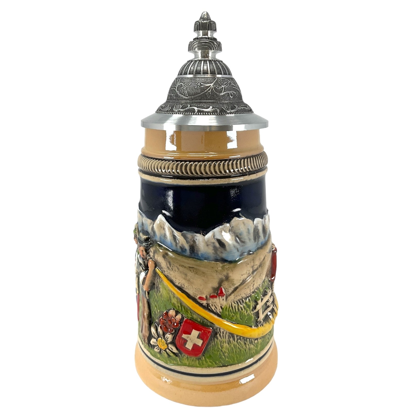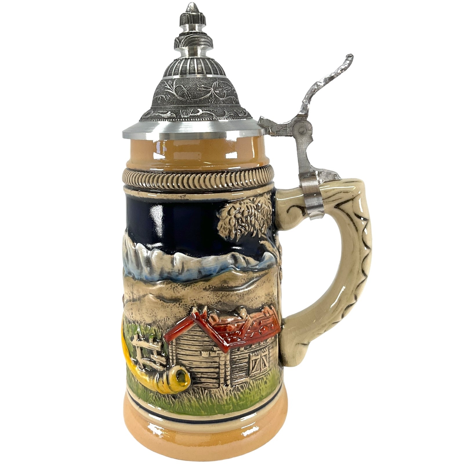 This beautiful stoneware beer stein was handcrafted in Germany by Zoeller & Born. . This attractive stein has a pewter lid. . The handpainted stoneware relief shows a Swiss horn blower in the Swiss Alps. . One side has a farm building and the other side has two women with their dog. . This 1/4 liter stein is about 8 inches tall. . Zoeller and Born is a family owned operation that has been producing high quality beer steins since 1956. They specialize in steins with stunning handpainted relief. Zoeller and Born is one of only a few remaining German stein companies that still produce their steins in Germany with 100% German materials and German labor..