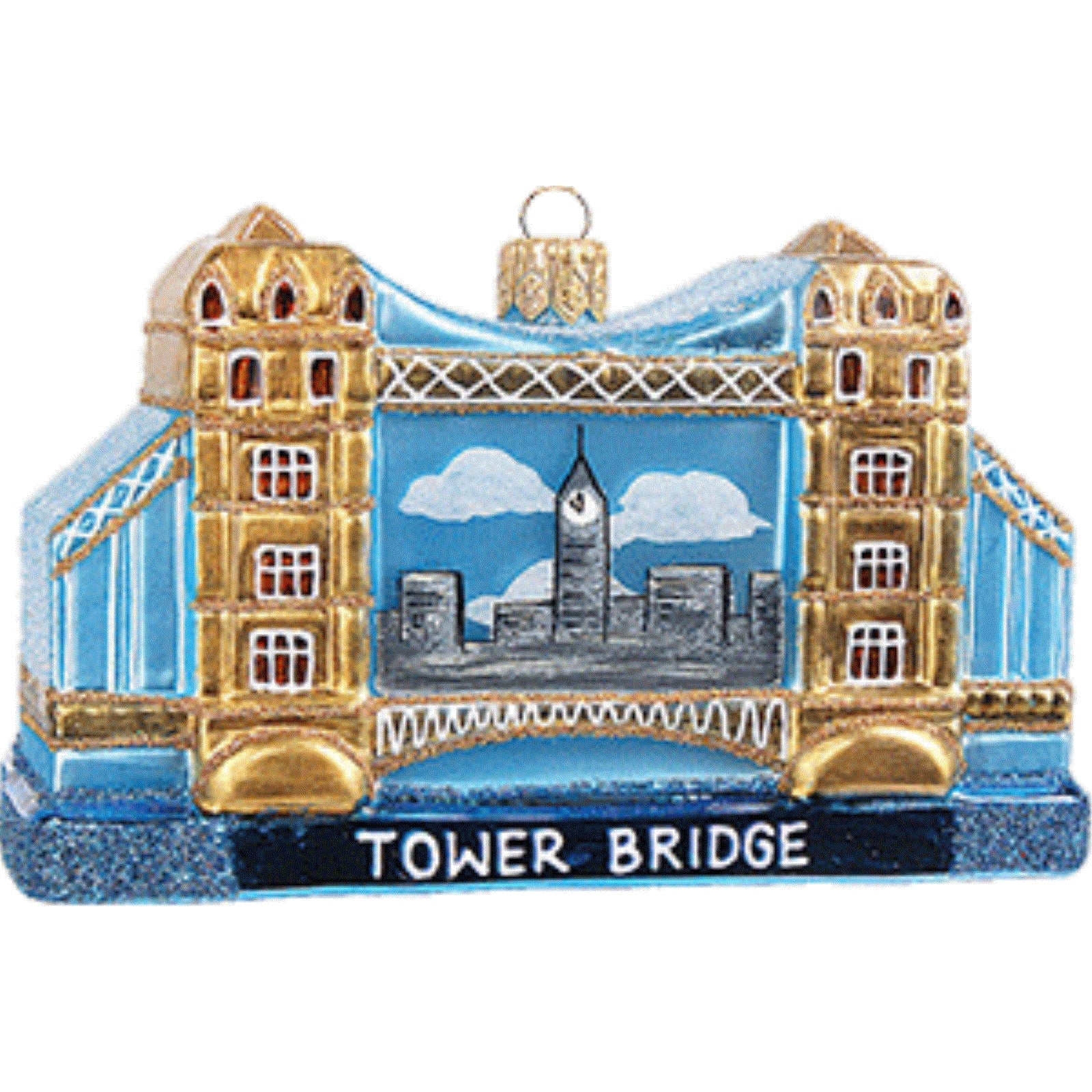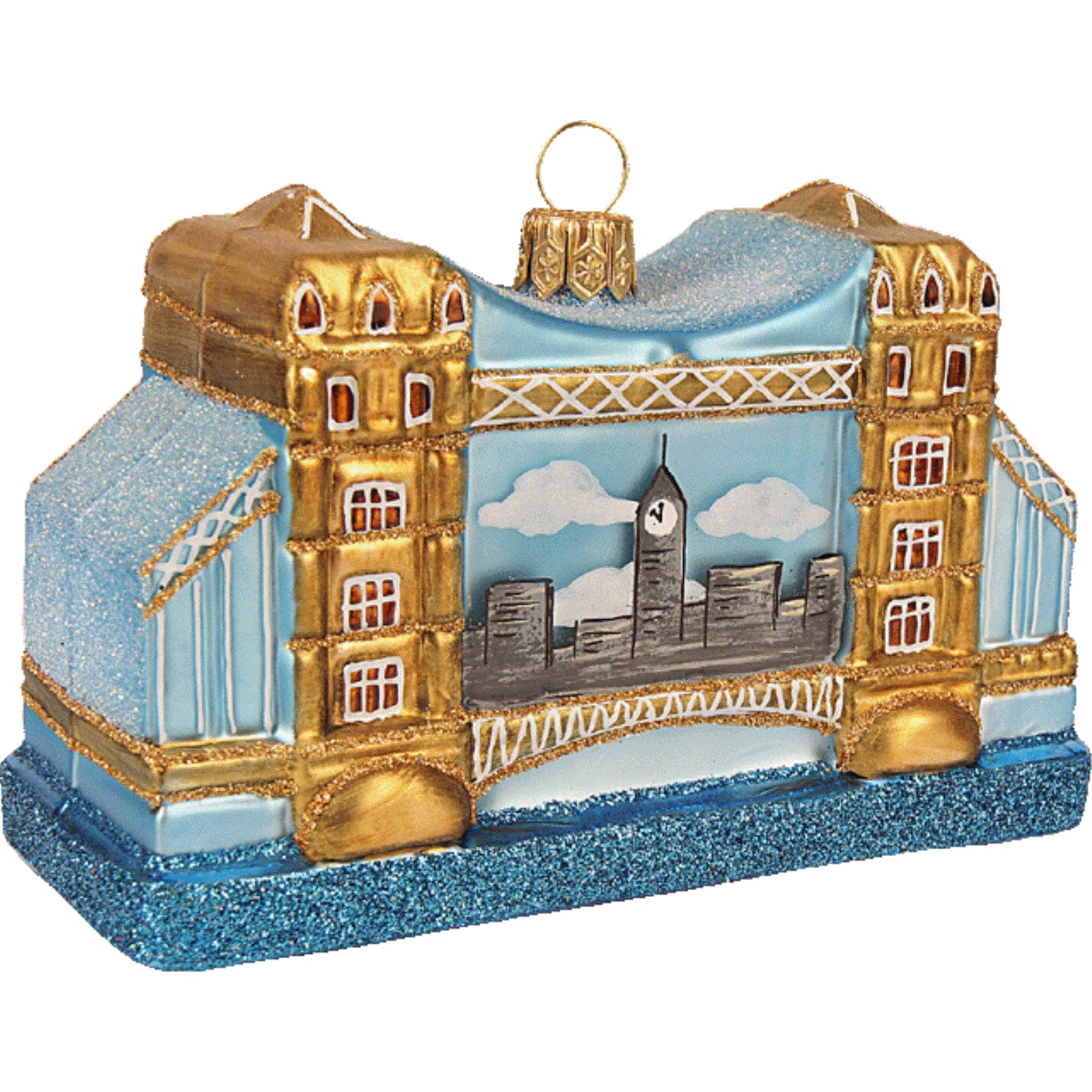 Tower Bridge, London England During the Day Ornament. Handcrafted in Poland. Hand-painted by Polish artisans. Made from mouth blown glass. Approximately 4.2 inches wide, 2.5 inches tall, and 1.7 inches deep. Includes original manufacturers box and packaging. Imported by Pinnacle Peak Trading Company.