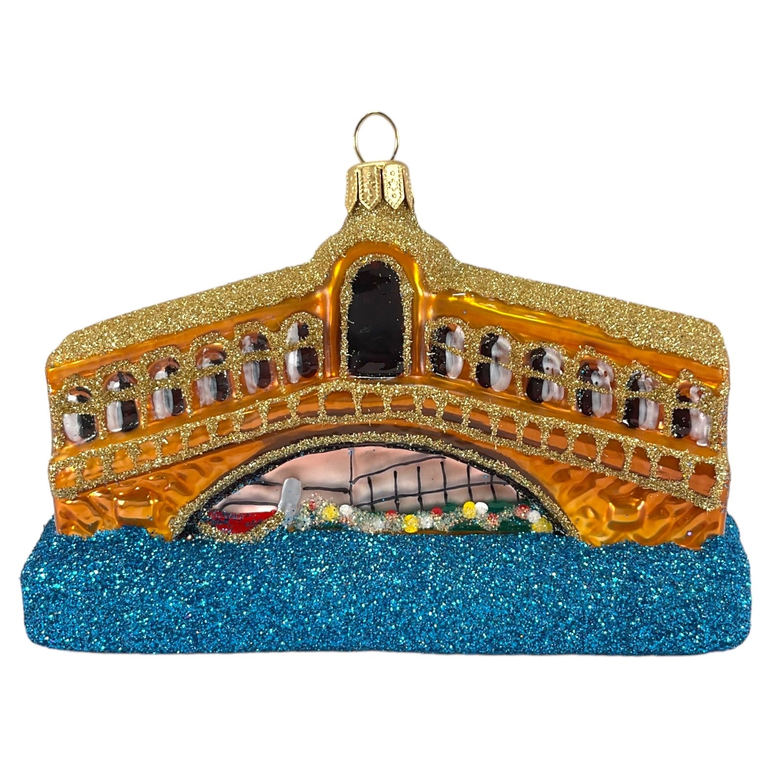 Venice Rialto Bridge Ornament. Handcrafted in Poland. Hand-painted by Polish artisans. Made from mouth blown glass. Approximately 4.6 inches long, 2.6 inches tall, and 2 inches deep. Includes ONE ornament. Includes original manufacturers box and packaging. Imported by Pinnacle Peak Trading Company.