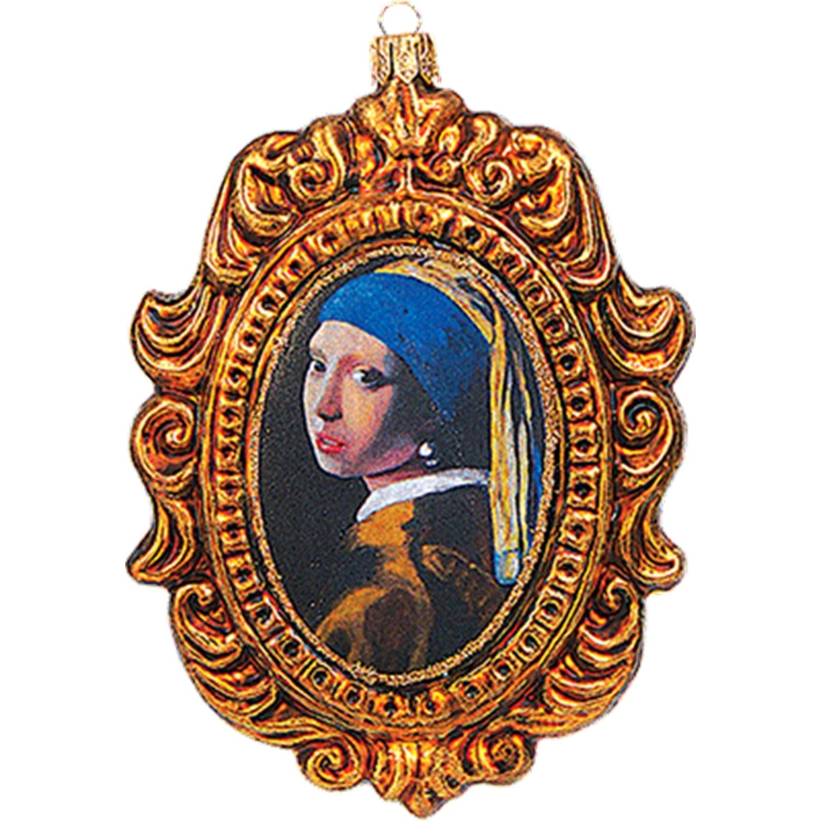 Girl with a Pearl Earring Gold Portrait Ornament. Handcrafted in Poland. Hand-painted by Polish artisans. Made from mouth blown glass. Approximately 4.5 inches tall (11 cm). Includes original manufacturers box and packaging. Imported by Pinnacle Peak Trading Company.