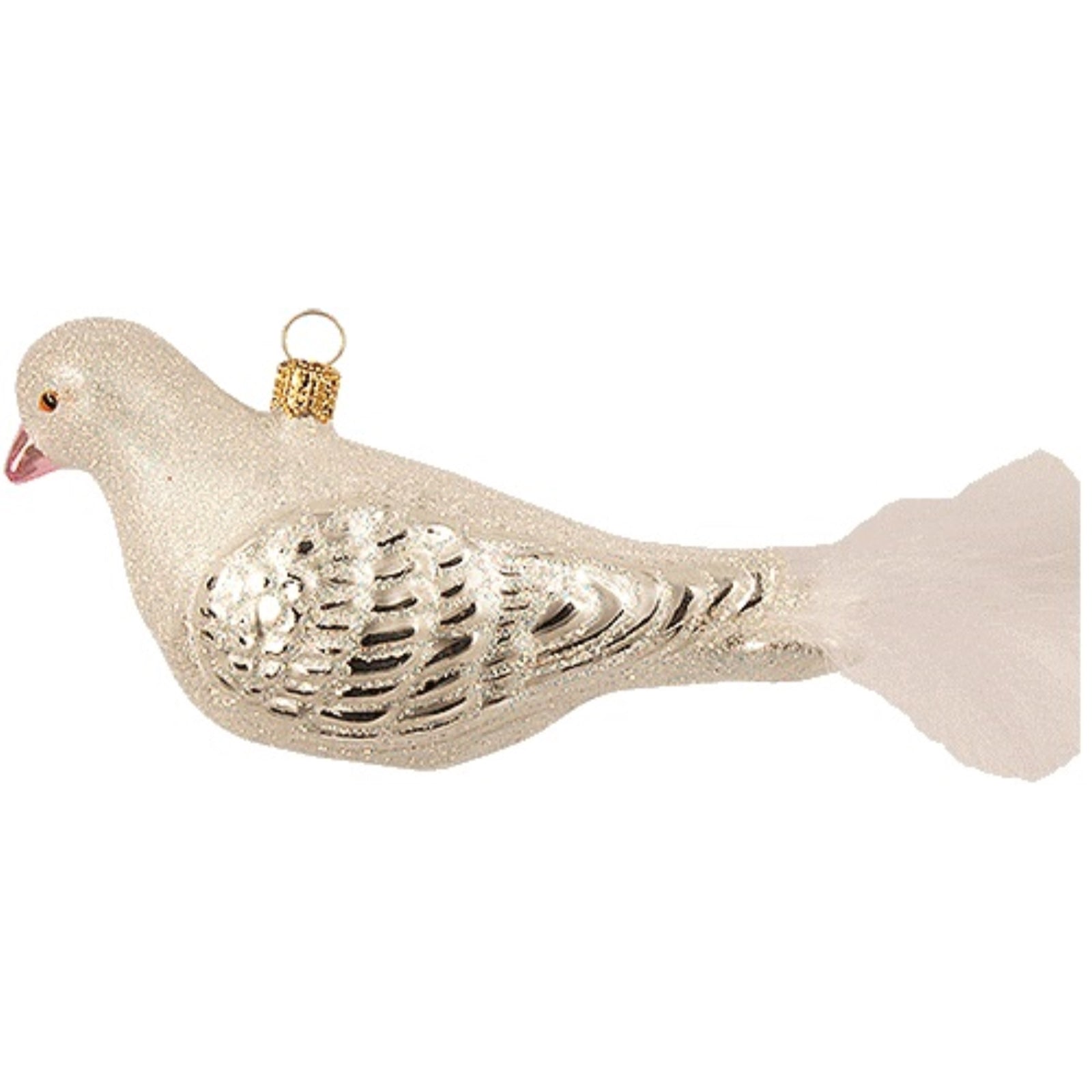 Dove Ornament. Handcrafted in Poland. Hand-painted by Polish artisans. Made from mouth blown glass. Approximately 5 inches long (13cm). Includes original Pinnacle Peak Trading box and packaging. Imported by Pinnacle Peak Trading Company.