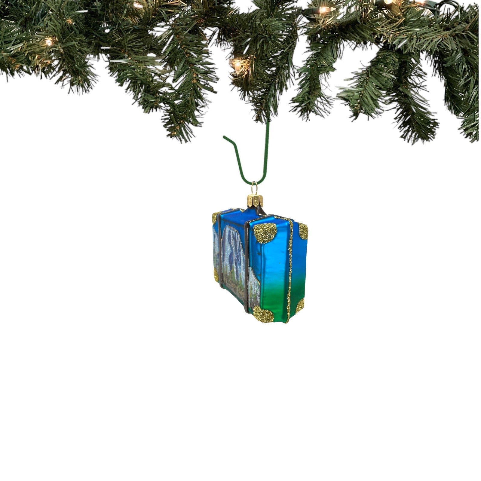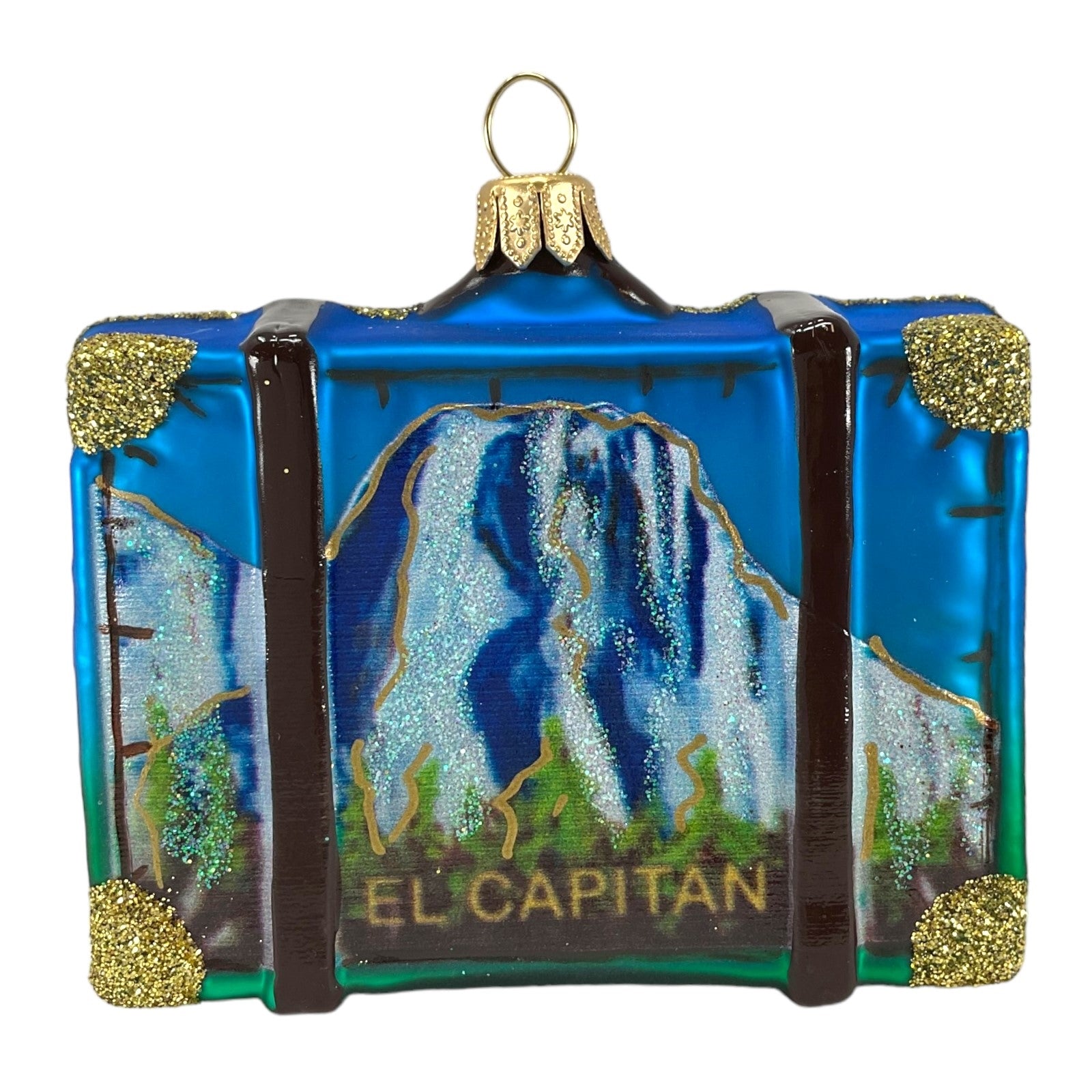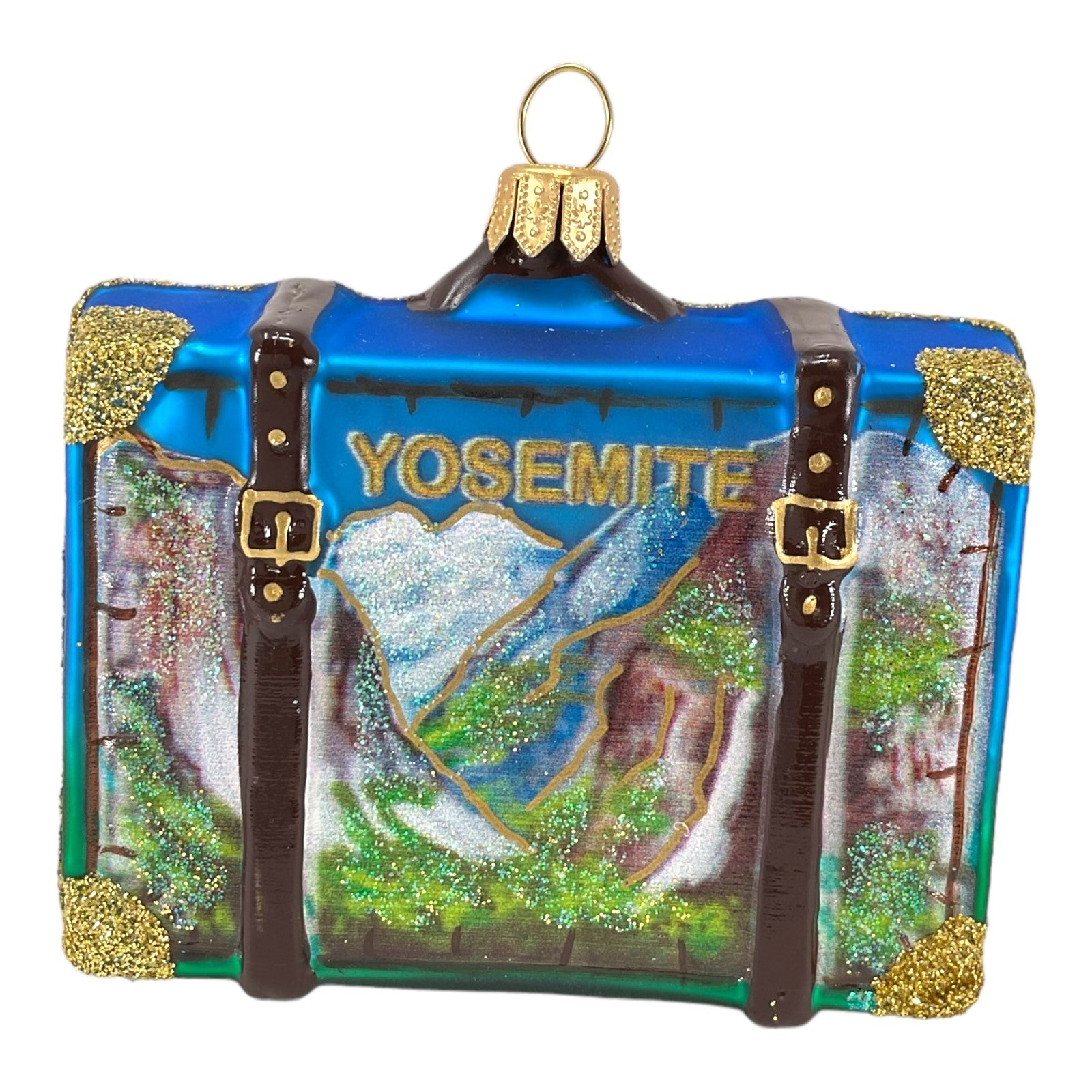 Yosemite Travel Suitcase Ornament. Handcrafted in Poland. Hand-painted by Polish artisans. Made from mouth blown glass. Includes ONE ornament. The picture shows the front and back of one ornament. Approximately 3.3 inches long (9 cm). Includes original Pinnacle Peak Trading box and packaging. Imported by Pinnacle Peak Trading Company.